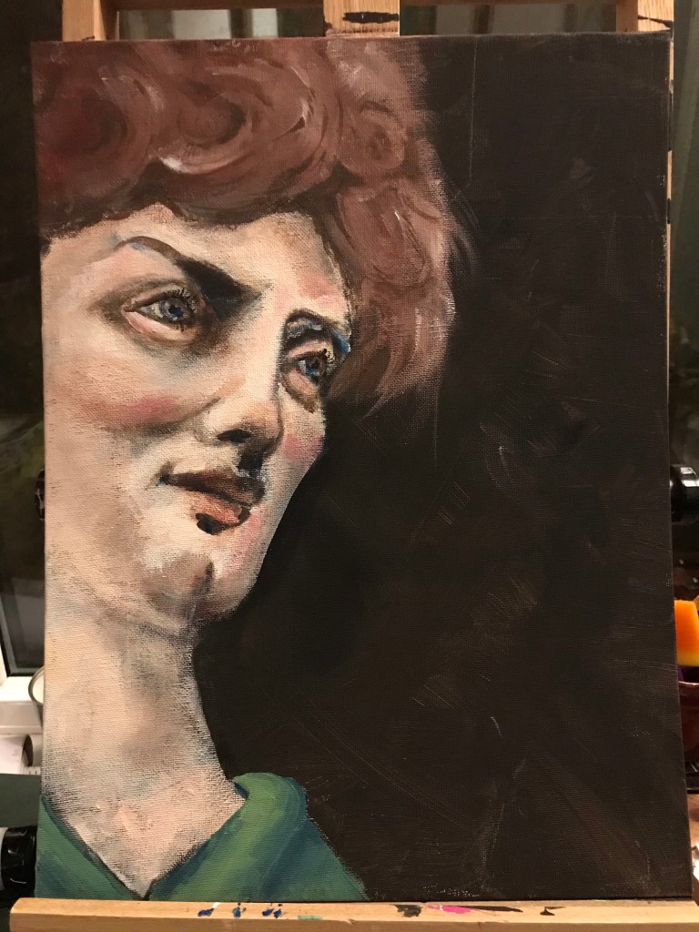 This painting is also based on a sculpture, as with Mr Moustache. There are some very unfinished parts to her, but I’m happy to leave her as she is, at least for now.