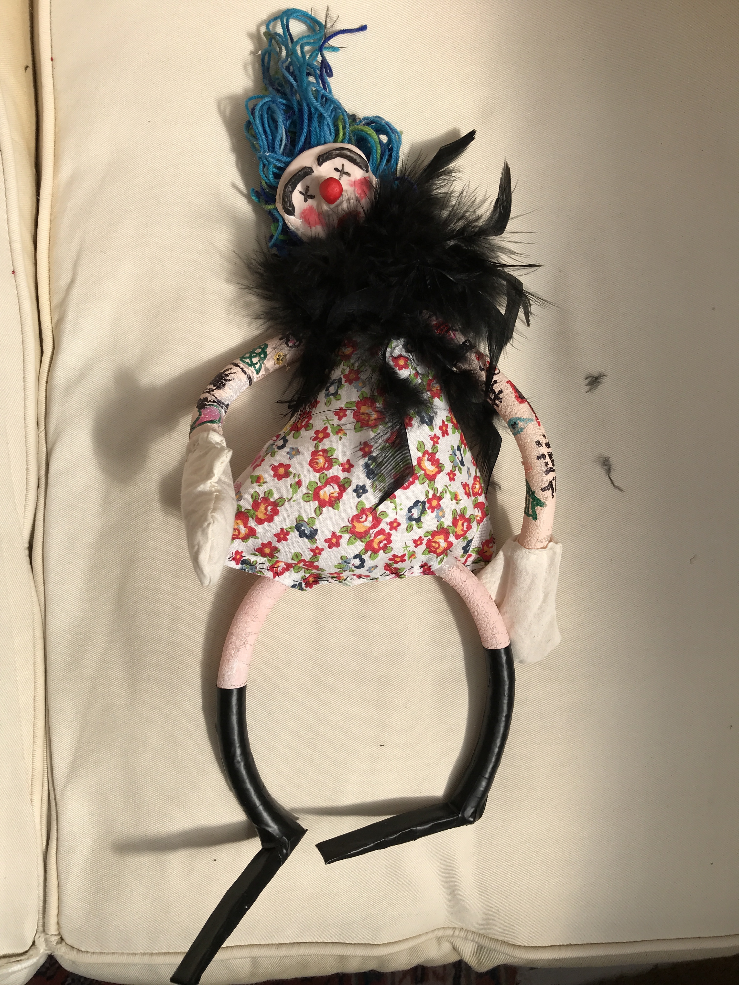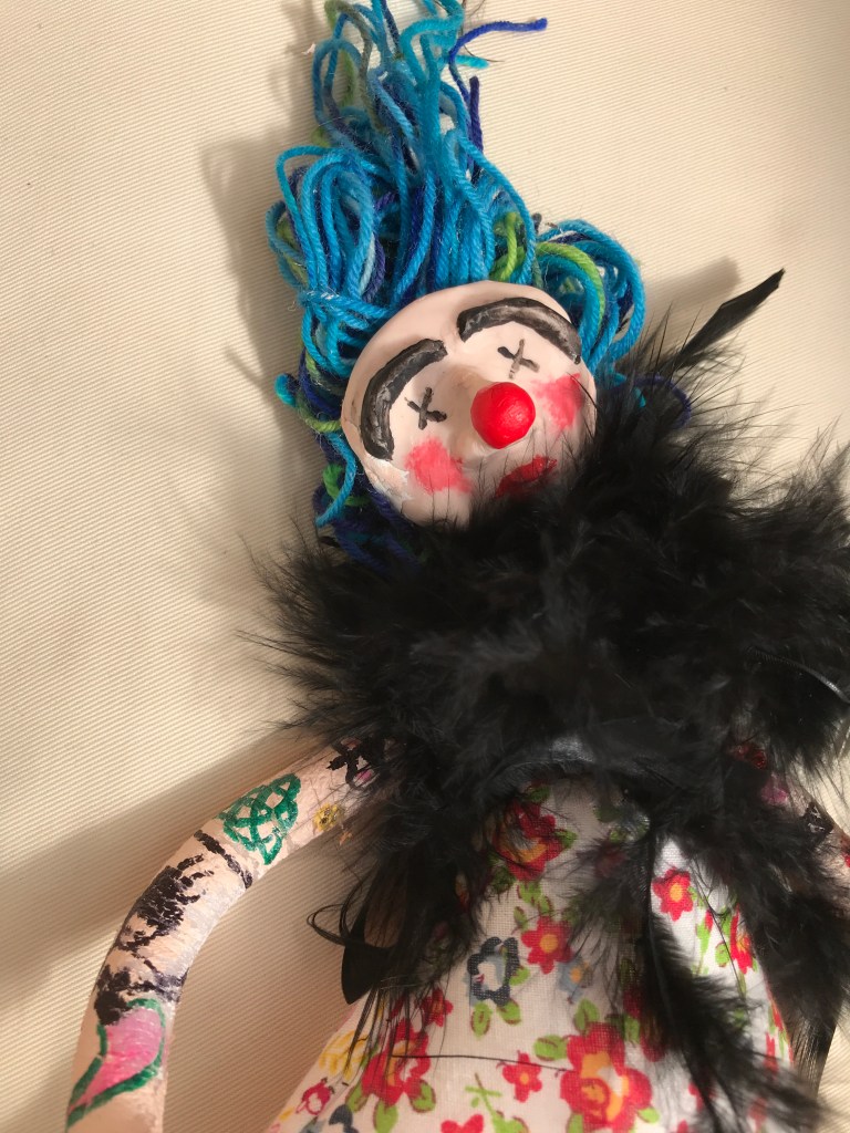 I have finally finished my rebel clown doll, which was started in All Fool’s, and continued in Witty Fool. His transvestism began as an escape from the clown persona, a chance to be himself and not perform, but the two parts of his nature have merged over time.