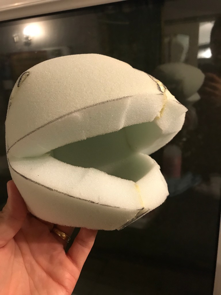 I found a free puppet head pattern online, printed it out, and cut the pieces out of upholstery foam, which I then glued together with contact glue.