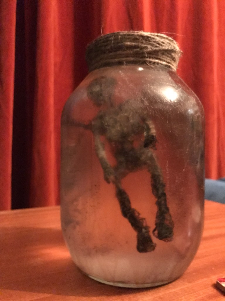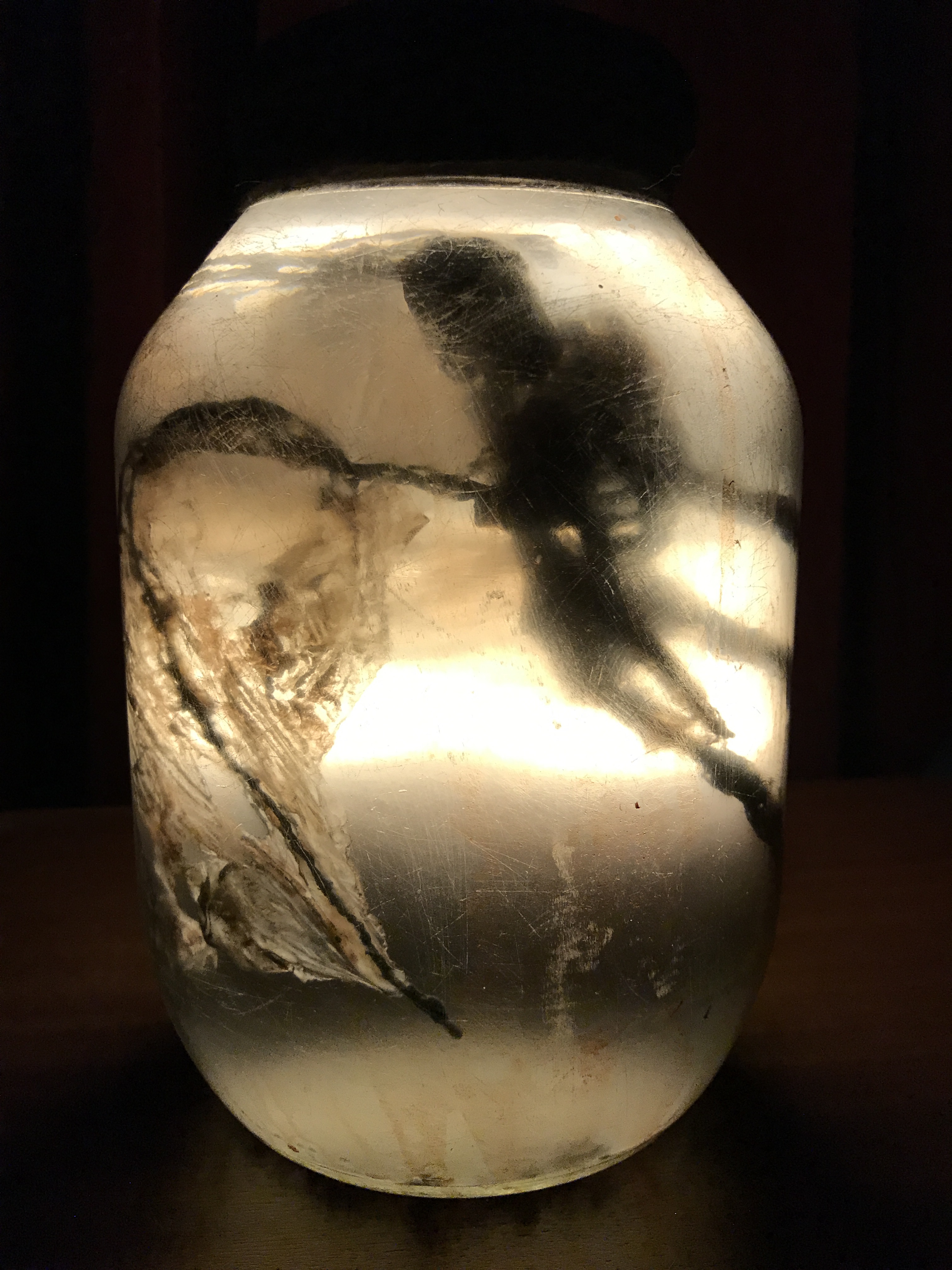 This is a pickled fairy creature of some kind, with half-preserved skin and tattered old wings, displayed in an old Victorian jar. For its final presentation, I would love to mount it into a wooden base which could be lit from below, giving the jar an eerie glow. Not sure i have the technical skills but I’ll give it a try.