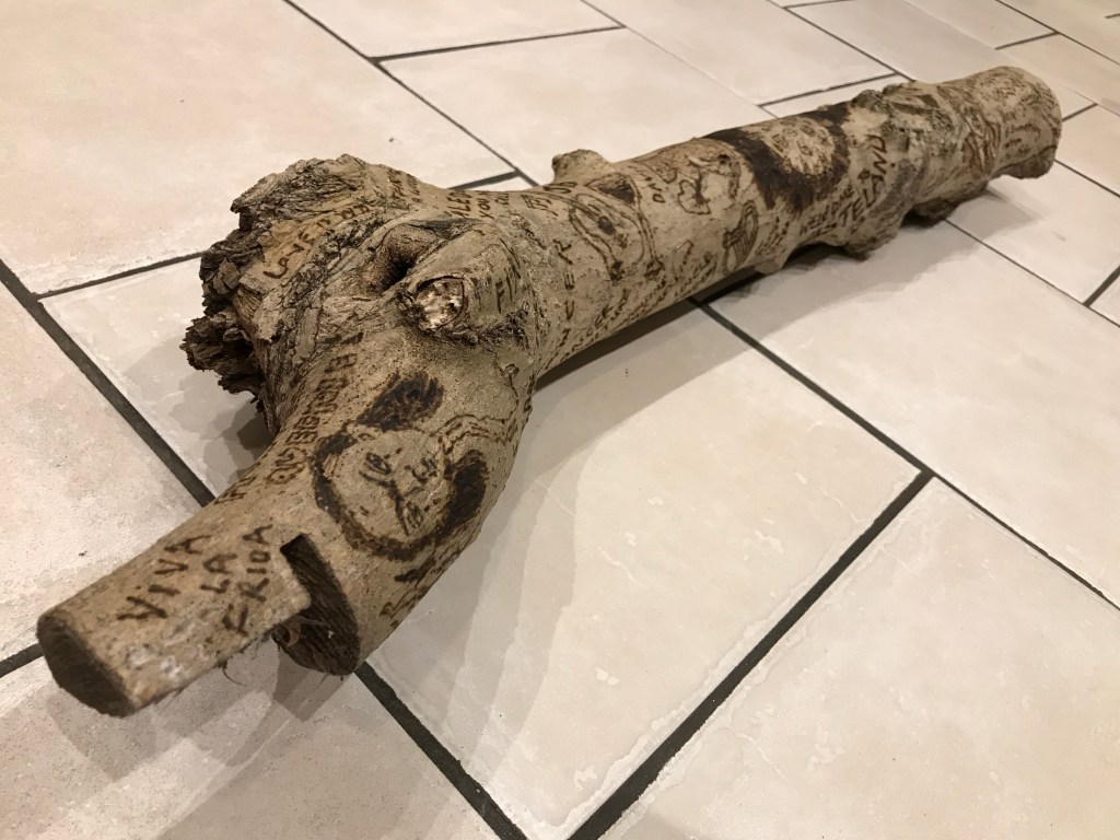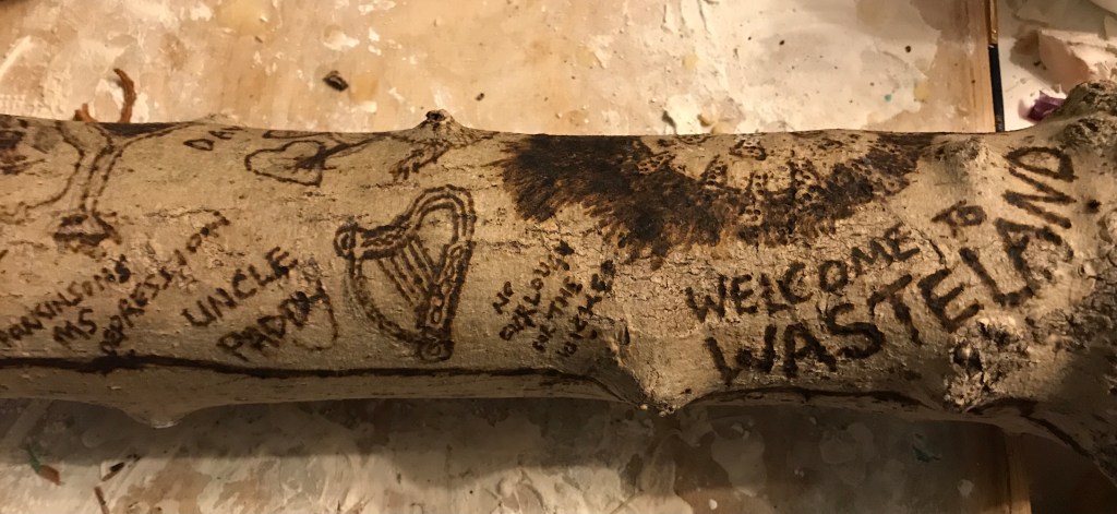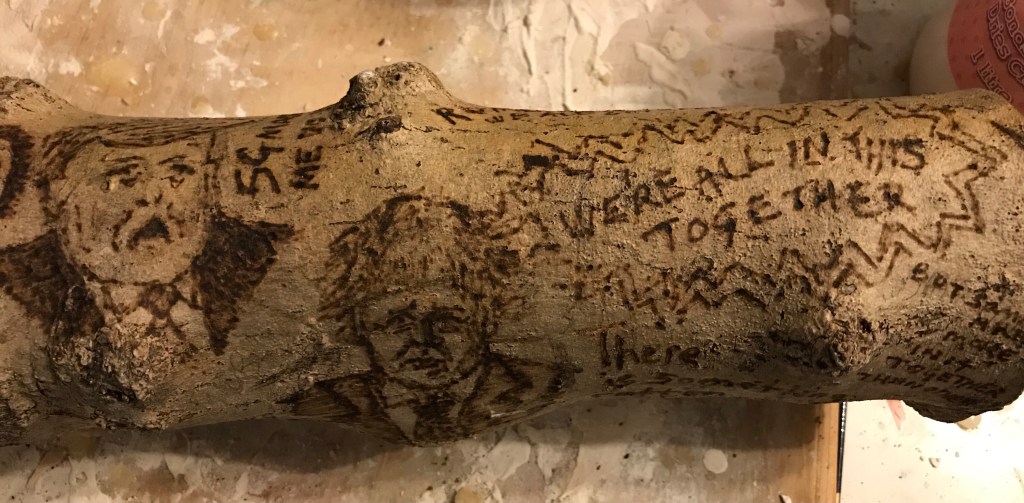 This is my interpretation of a Yule Log, imbued with the power of images and messages which I have burned into it with my pyrography pen. I have inscribed it with some of the tragedies, nightmares, demons and regrets of 2020 that I should like to release and send spiralling off into the void of the black night.