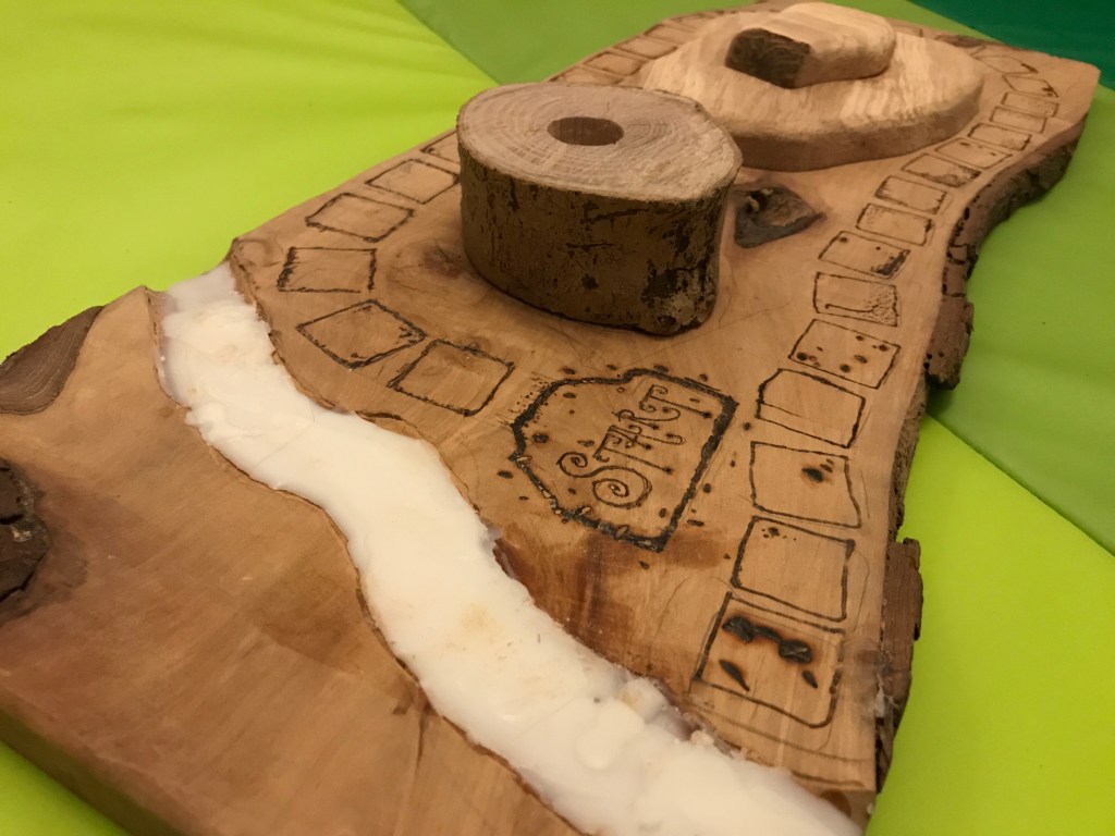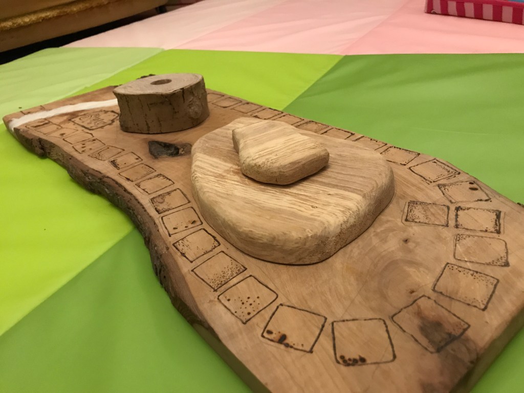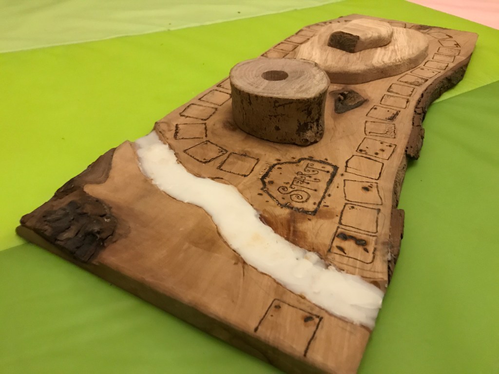 I’ve done a bit of work on the board, having sanded out the river with my dremel tool, and filled it with wax, added more squares with the pyrography pen, and glued down the 3D blocks – one for the site of the devilish celebrations, the other the candle holder which determines the length of the gameplay. Sadly I forgot to buy a candle.