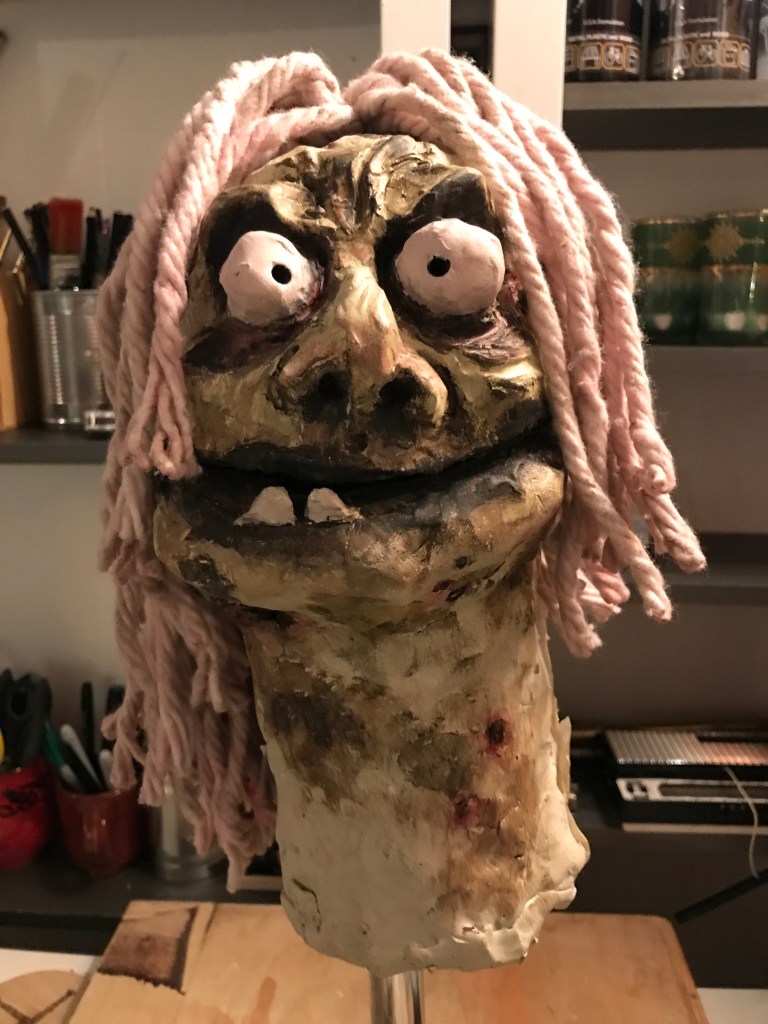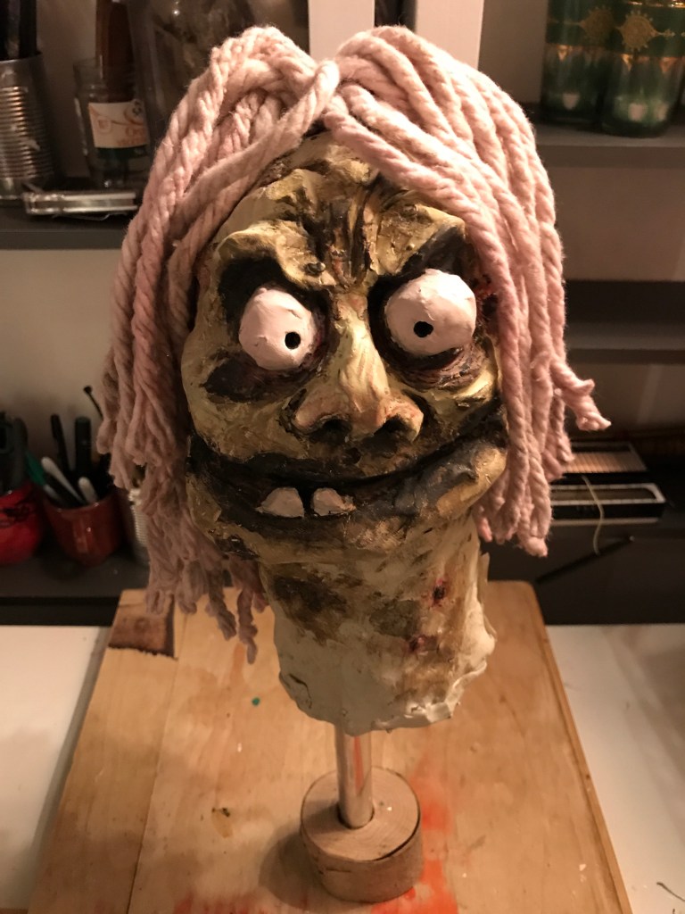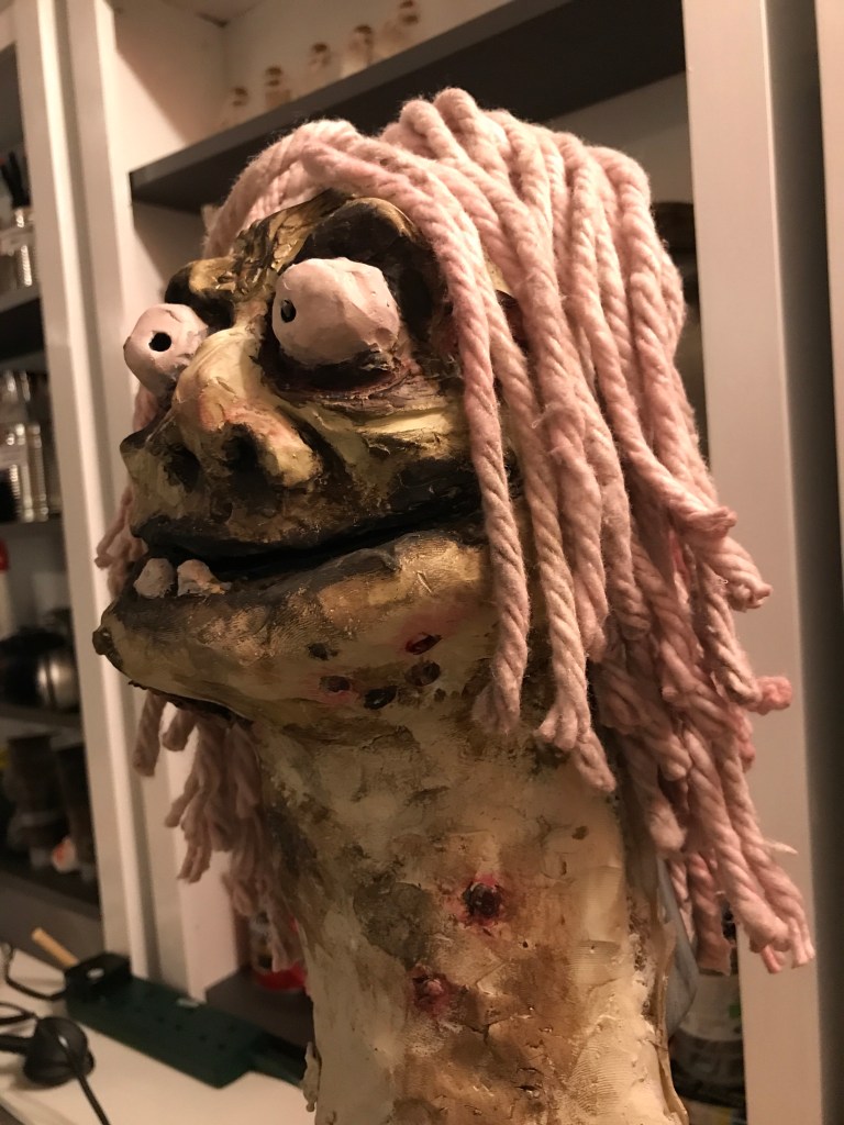 There’s not enormous progress with Robbie Redcap, but I have given him hair, made from a cheap mop head. I soaked it in an acrylic wash of brown and red, hoping to give it a sense of being dyed from his blood drenched hat, but instead it looks like an attractive pink rinse. He also feels like he has adopted a slightly dashing Isaac Newton look.