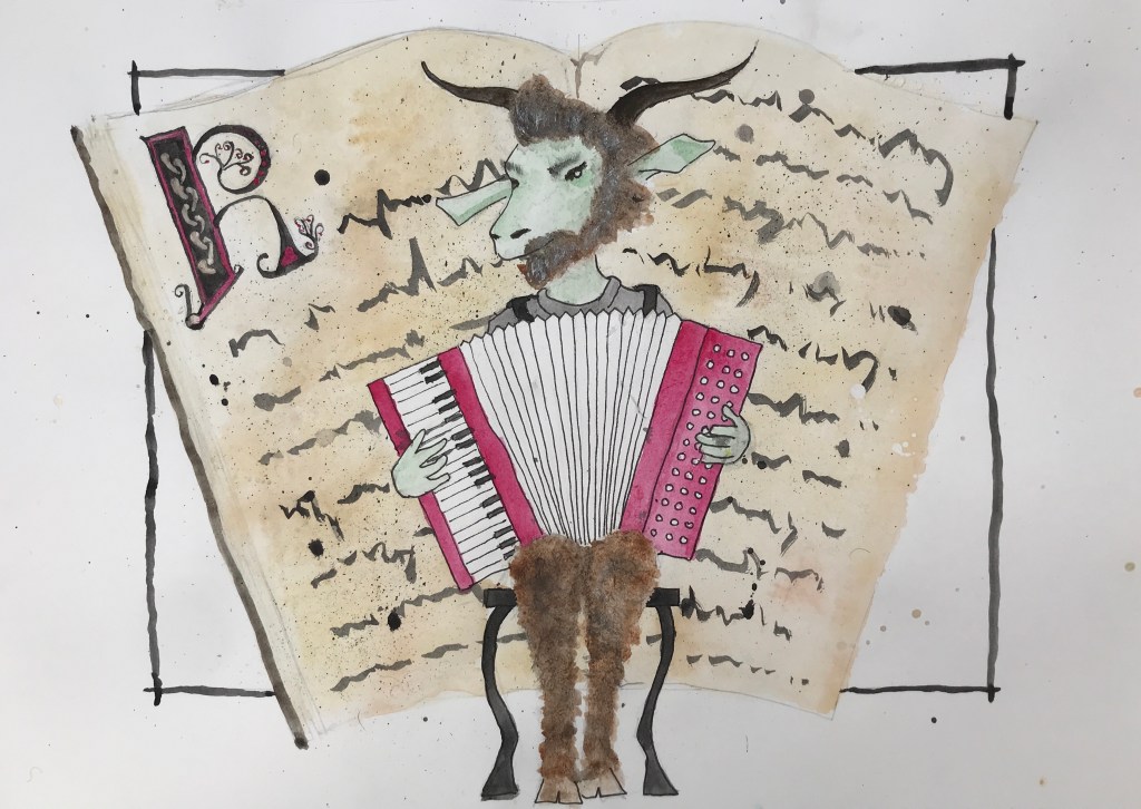 So it’s only task number 1 and a pretty loose brief, but it has definitely already made me want to think more about the pictures I produce. I don’t know if it’s any good, or if it meets the brief, but here is it, an accordion playing goat, large of nose, hairy of leg, bequiffed, devilishly good looking, and mostly quite jolly.