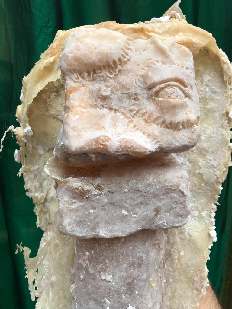 After about twenty layers of latex I have cracked open my mould for my Android character. I had to take a hammer to it because of my lack of skill in mould making, and as expected it has a monumental flash line of latex around it that I’ll have to slice off, but overall I’m really pleased.