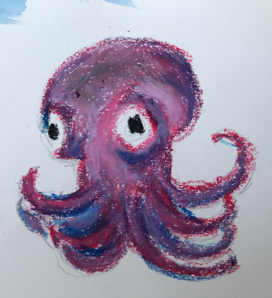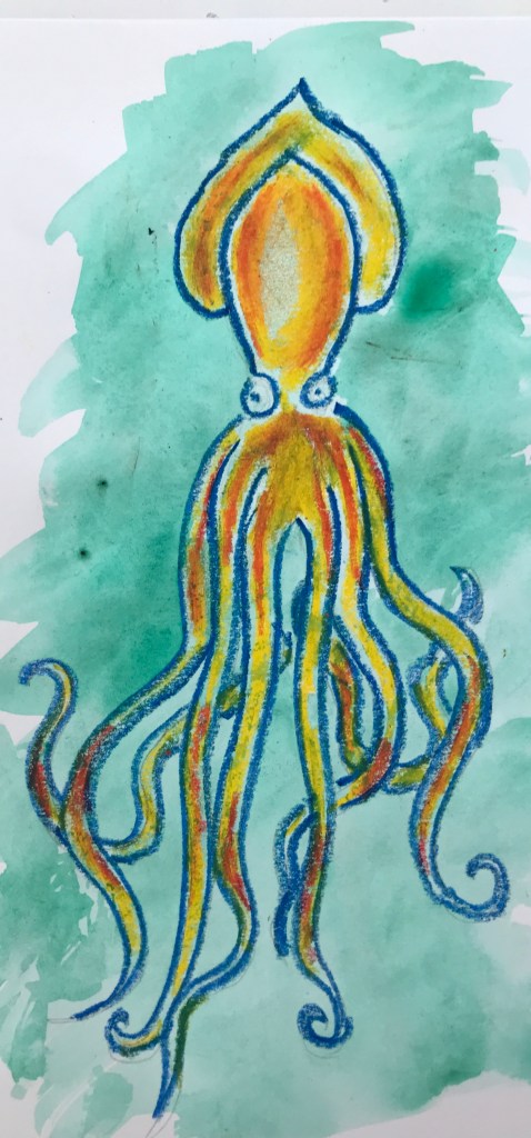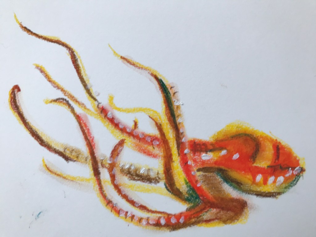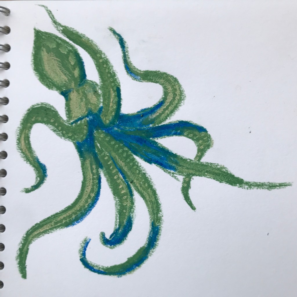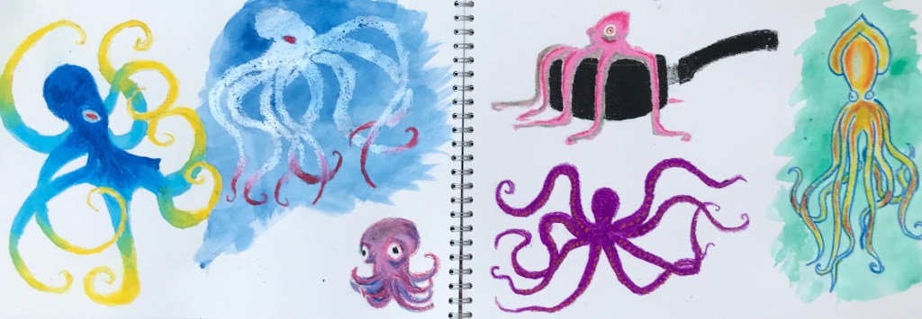 This is another task set by the Domestika course I’m currently doing, to play with various different oil pastel techniques. The theme I have chosen for this is Octopusses.