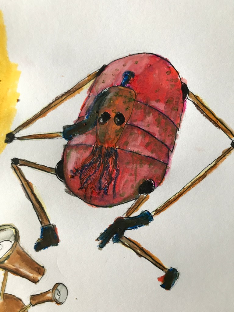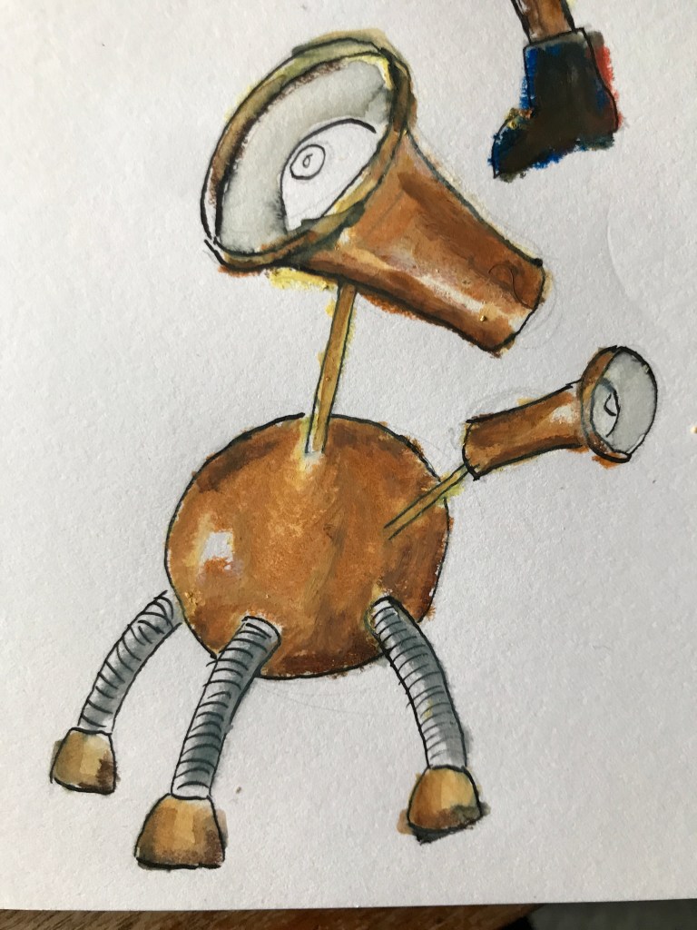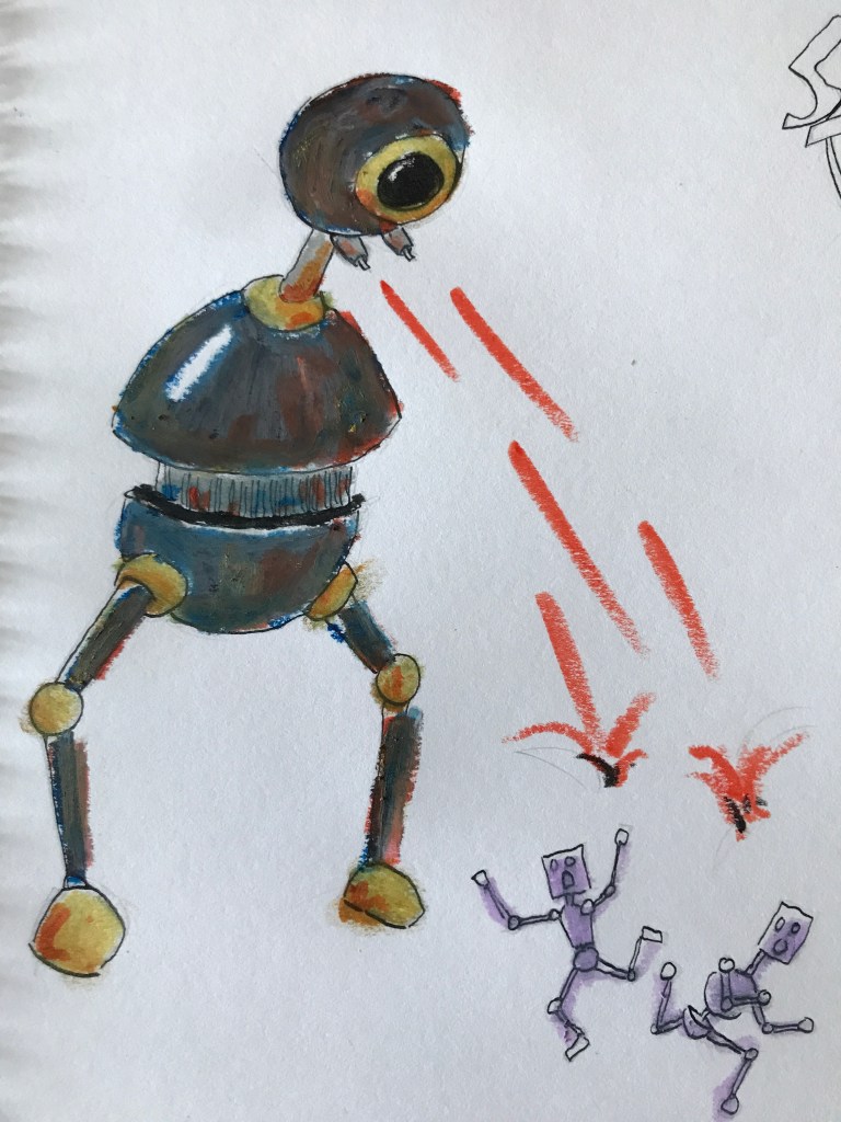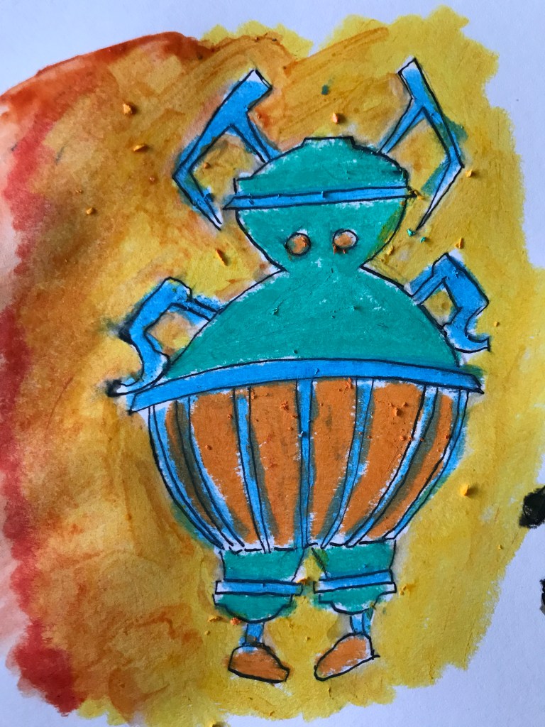 What I did eventually find was that they blend together in a really lovely and messy way, which I then used with ink drawings of robots to try and create something a bit muddier and rustier and more me.