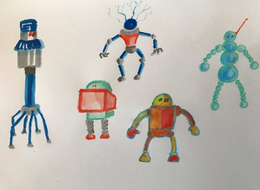 Here is another attempt at the Playing with Crayons exercise for my course, this time with watercolour crayons and robots as subjects.