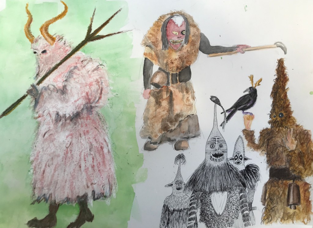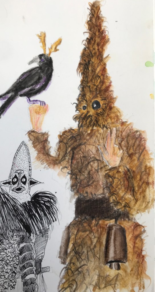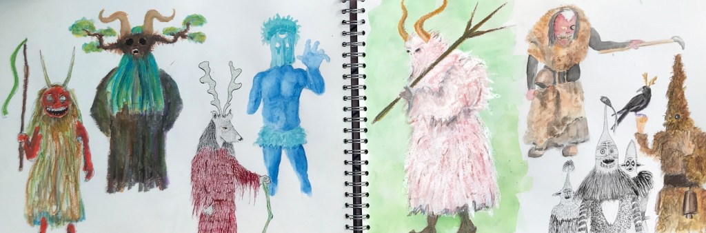 And here is my final final Create Your Universe project to complete the Unlock Your Creativity course I’ve been doing – a series of spirit beings inspired by masked cultures from around the world, drawn in a mix of media and styles.