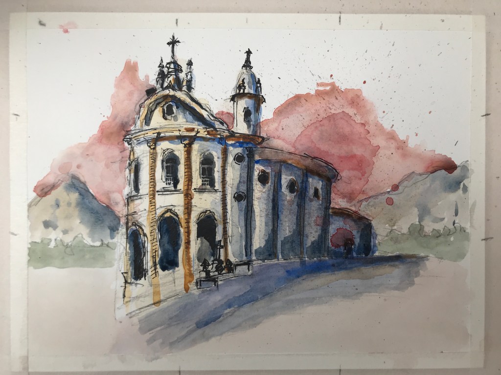 This is the final painting of the church I first looked at in Church of Black Gold, an option for my Architectural Sketching course.