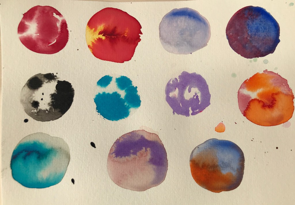 This is the next exercise for the Modern Watercolours course I’m doing on Domestika, experimenting with various media and techniques, which look vaguely like planets.