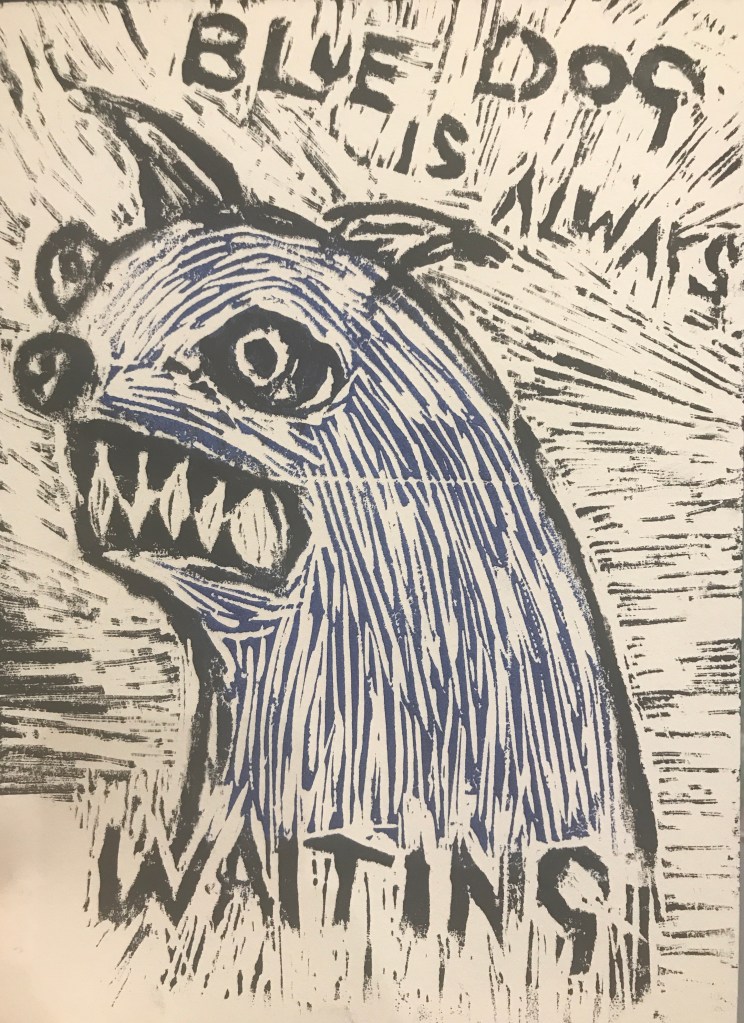 Churchill talked of his depression as being a Black Dog and Nick Drake sings of the Black Eyed Dog. It’s a strange metaphor as dogs tend to be quite jolly, but I guess the Black Dog is a significant folkloric motif surrounded by dread, so perhaps it’s a symbol held deep in the human psyche. My dog is blue because I just bought some new blue printing ink from Cass Art!