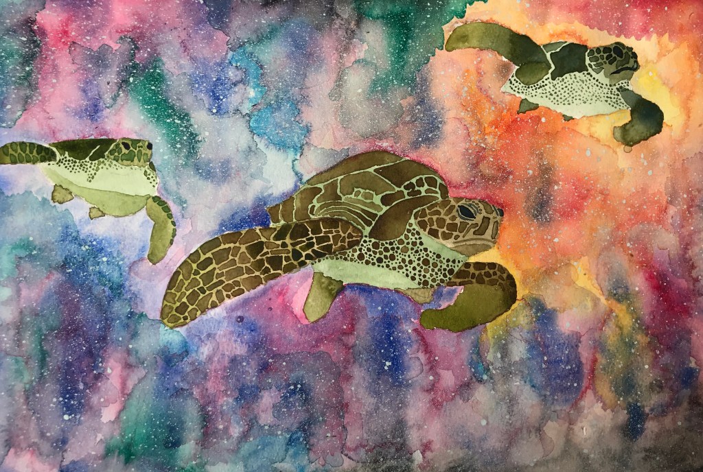 One more final project for my Modern Watercolour Techniques course, because who doesn’t need flying space turtles in their life? I think it would’ve worked better to have made them less natural colours, maybe?