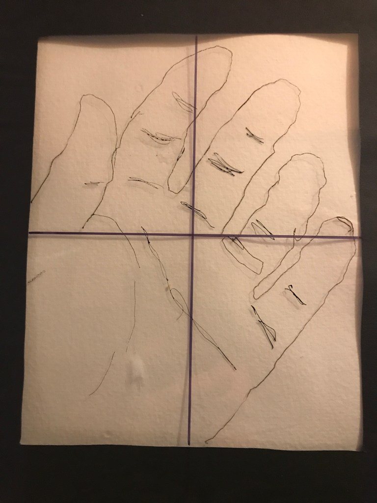 The next task in my efforts to improve my drawing skills (using the book Drawing on the Right Side of Your Brain by Betty Edwards) is to draw my hand on a transparent home-made viewer. Very straightforward – much easier than the upside down task – and I can see how it’s useful in starting to observe the real shape of things.