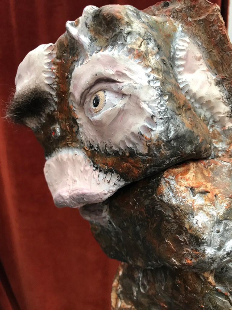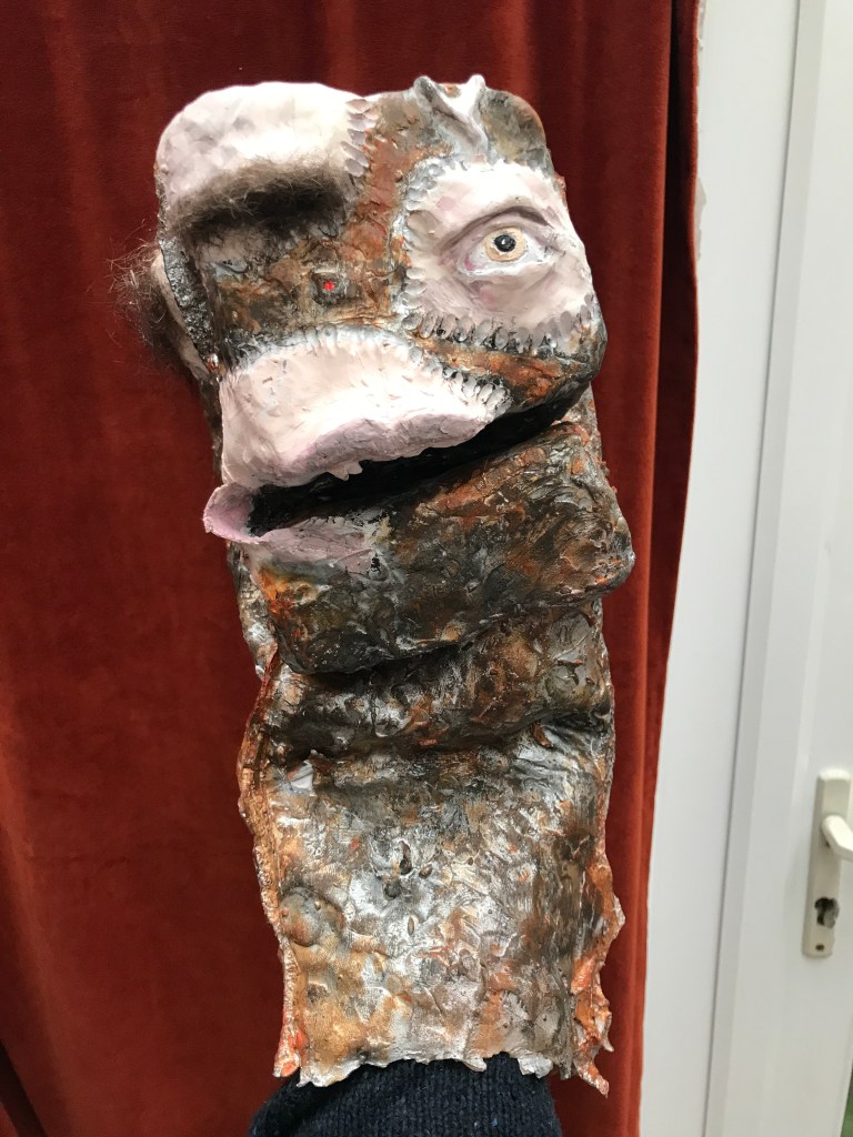 A small evolution of my robot puppet, he now has a marigold glove superglued inside to act as the mouth mechanism, and I’ve glued hair onto the back of the head and eyebrow. I feel like the paint on the skin areas needs improving but after that I’m not sure that there’s much more that I can do.