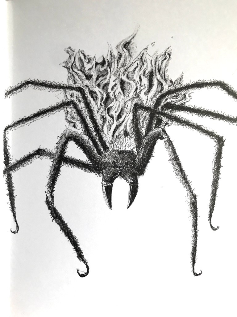 This is a more developed sketch for my Surrealistic Illustration course, from ideas I played around with in the post Forbidden Territory. This is a spider on fire. Turns out that fire is really hard to draw in fineliner pen!