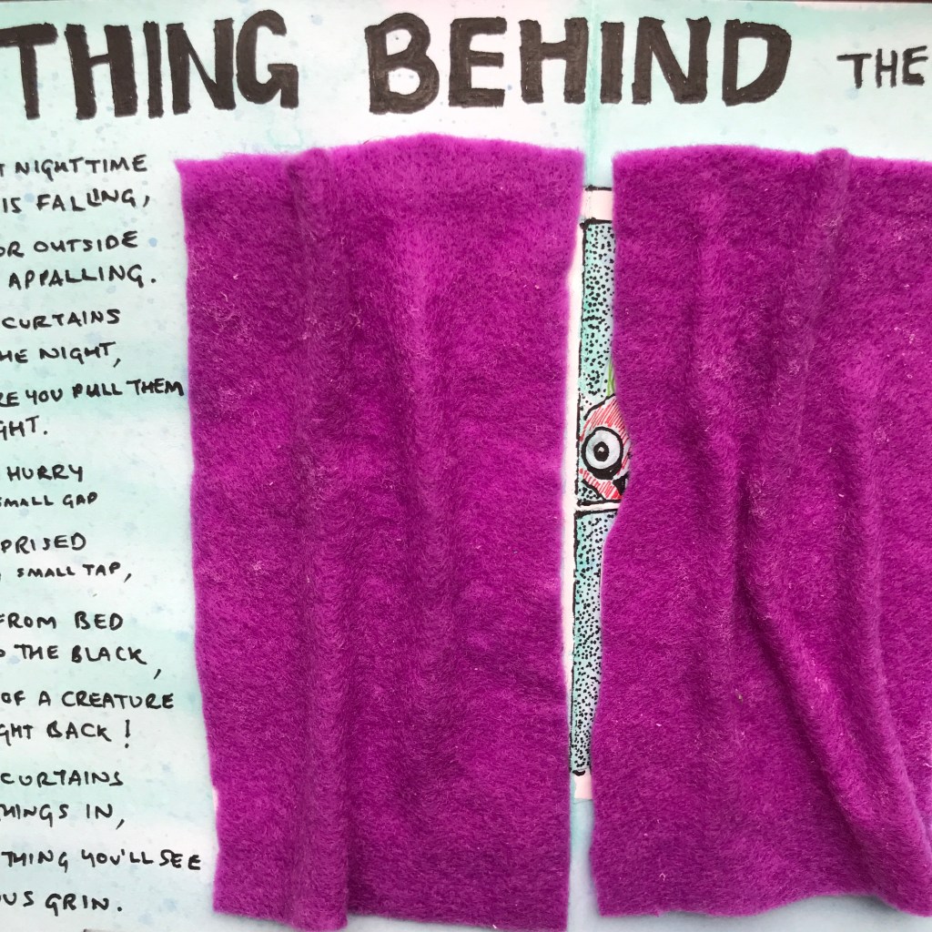 I’m not so happy with this. I like the fact that the curtains are made of fabric, but the monster illustration is not very good, and the background colour doesn’t work, and the mechanism isn’t interesting, and my writing slants upwards. And it’s very time consuming for something you think isn’t very good.