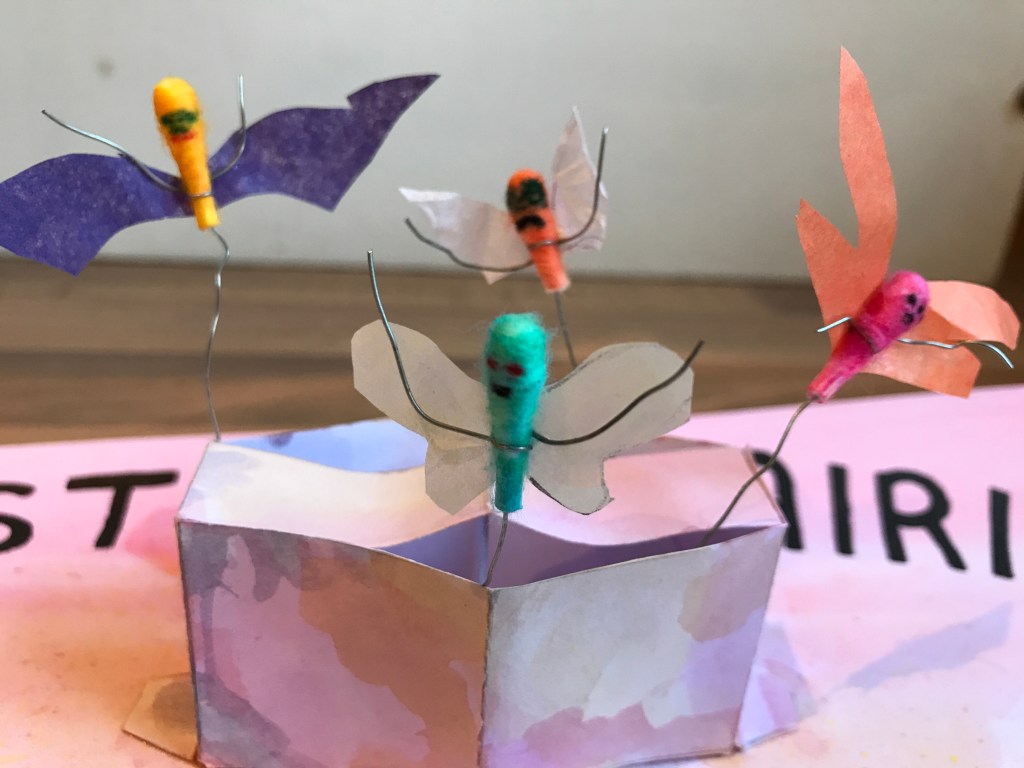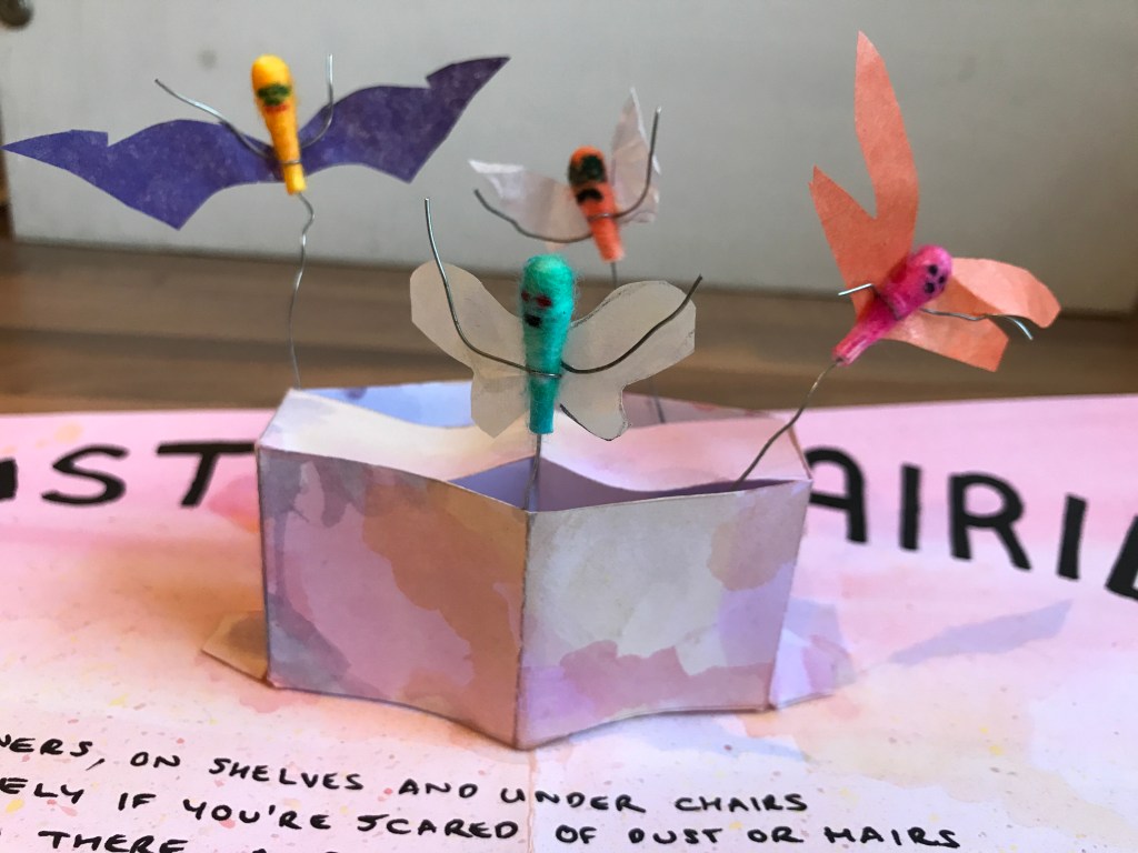 Another page for the pop up book I’m in the process of creating for my kids. This week’s household beast is the Dust Fairy. Two more pages to go, but it may be a while as they are pretty tricky, even simple mechanisms like this one. Not sure my poetry skills are really up to scratch either!