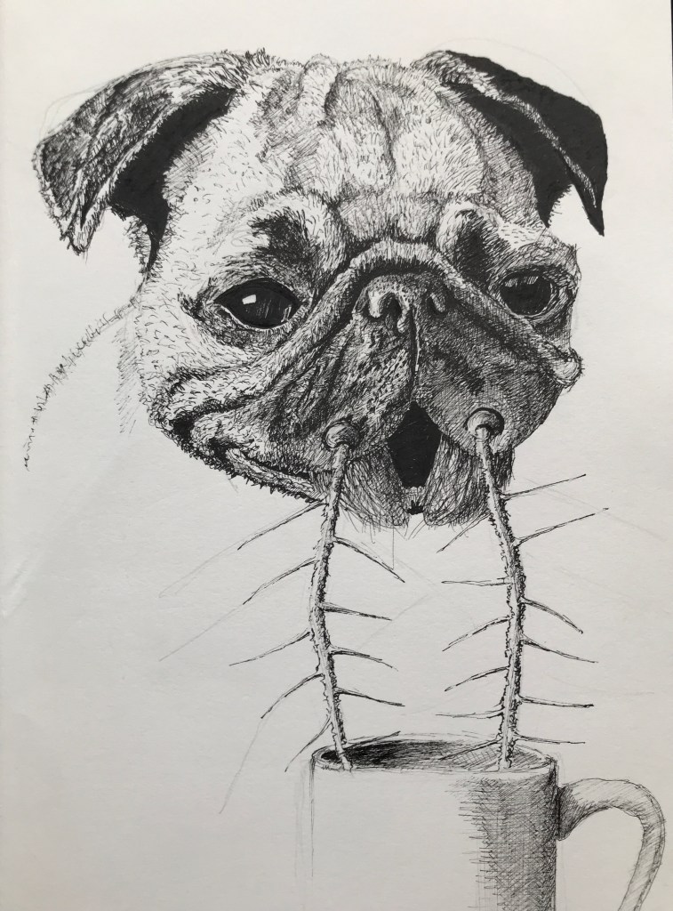 I think maybe my problem is that my ideas just don’t really make much sense. Rather than just go with something that steals socks, my idea was a pug with insect mouth feelers that sucks tea out of your mug while you’re not looking.