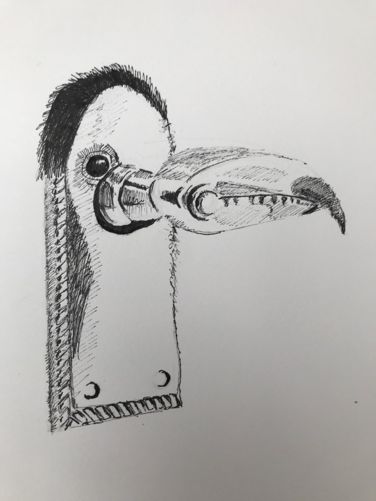 It’s a poor excuse for a very bad pun, but here is the next drawing in my surrealistic illustration course, a toucan door handle. My heart wasn’t really in this one I think, and it suffers a great deal as a result. What a knob.