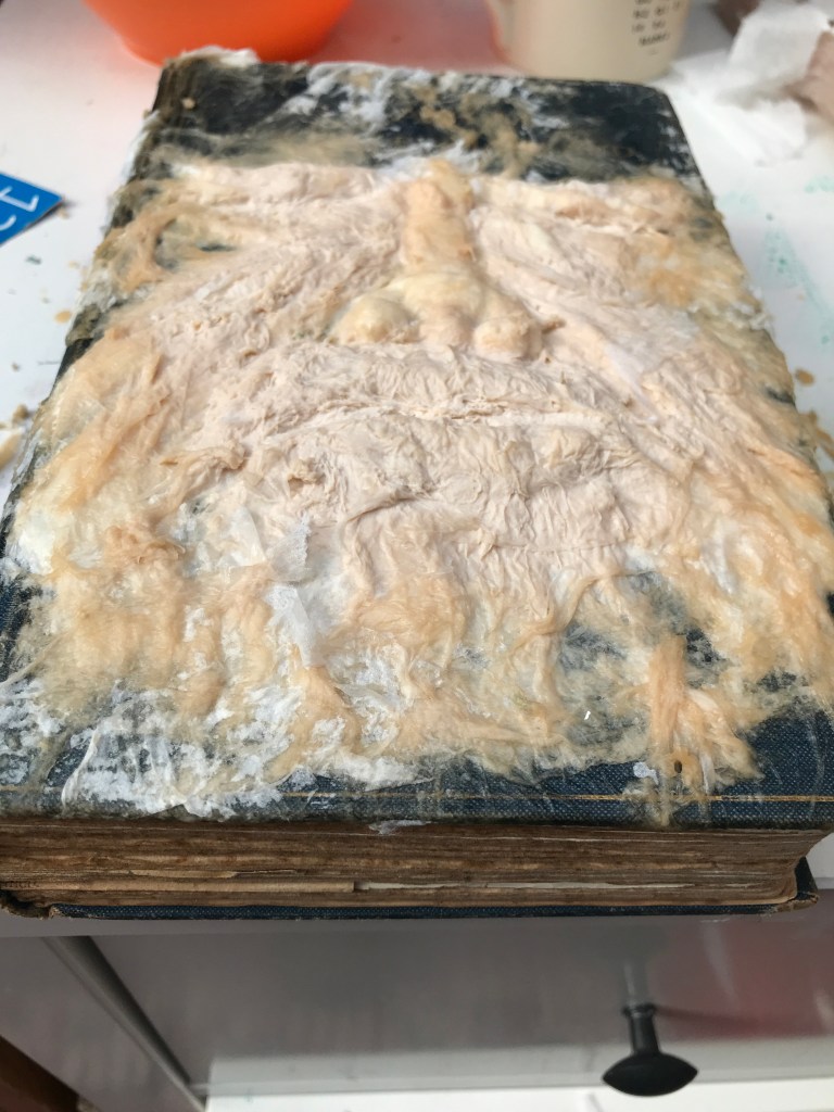 This one is a book bound in human skin (which I attempted before, not very successfully, way back in this post), so I have taken an old book and am adding layers of tissue and latex to build up the saggy wrinkly rotten details of the face.