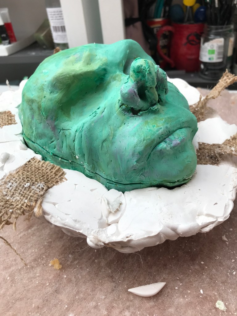 The head was sculpted in plasticine (I imagine there are much better clays, but that’s what I had) and then I made a plaster mold around it, and that’s the state it’s in at the moment, waiting for latex to be poured in. I’m not sure that this was the best way of doing it, as I now have to figure out how to fill the hollow head to make it solid. but the texture of latex feels like it will be right for the prop.