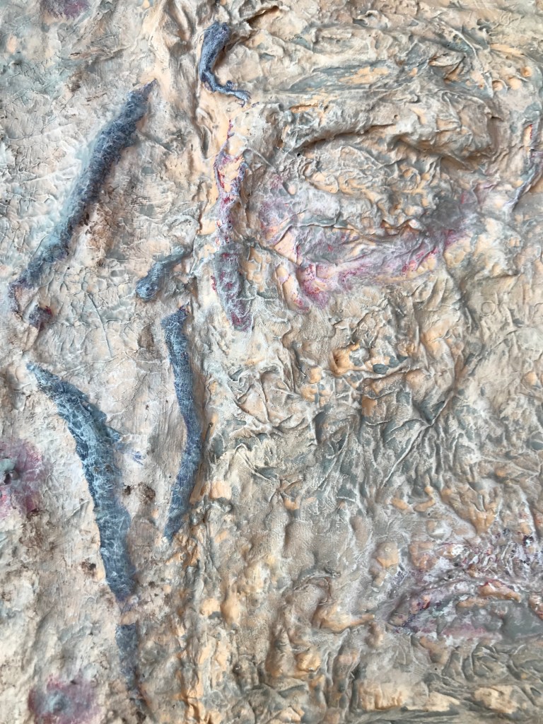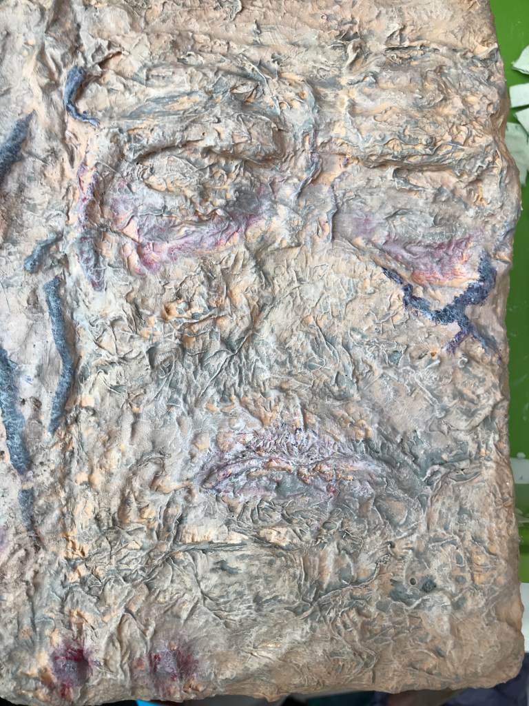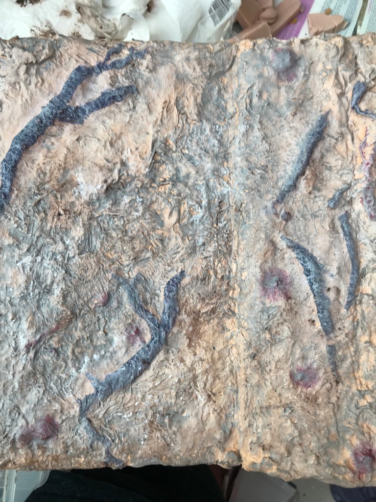 I’m trying to paint up my human-skin-bound book. I think the best way to do it is with a spray gun which I don’t have, so I’m trying it with just brushes and acrylic paint, attempting something vaguely fleshy, veiny and dessicated.