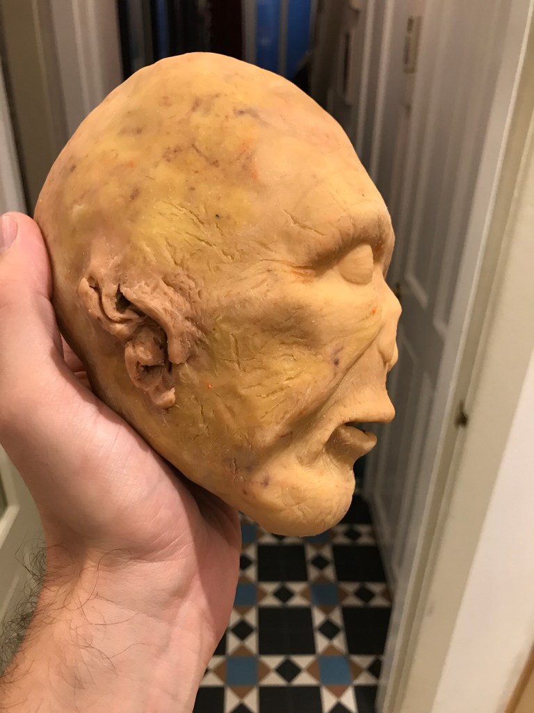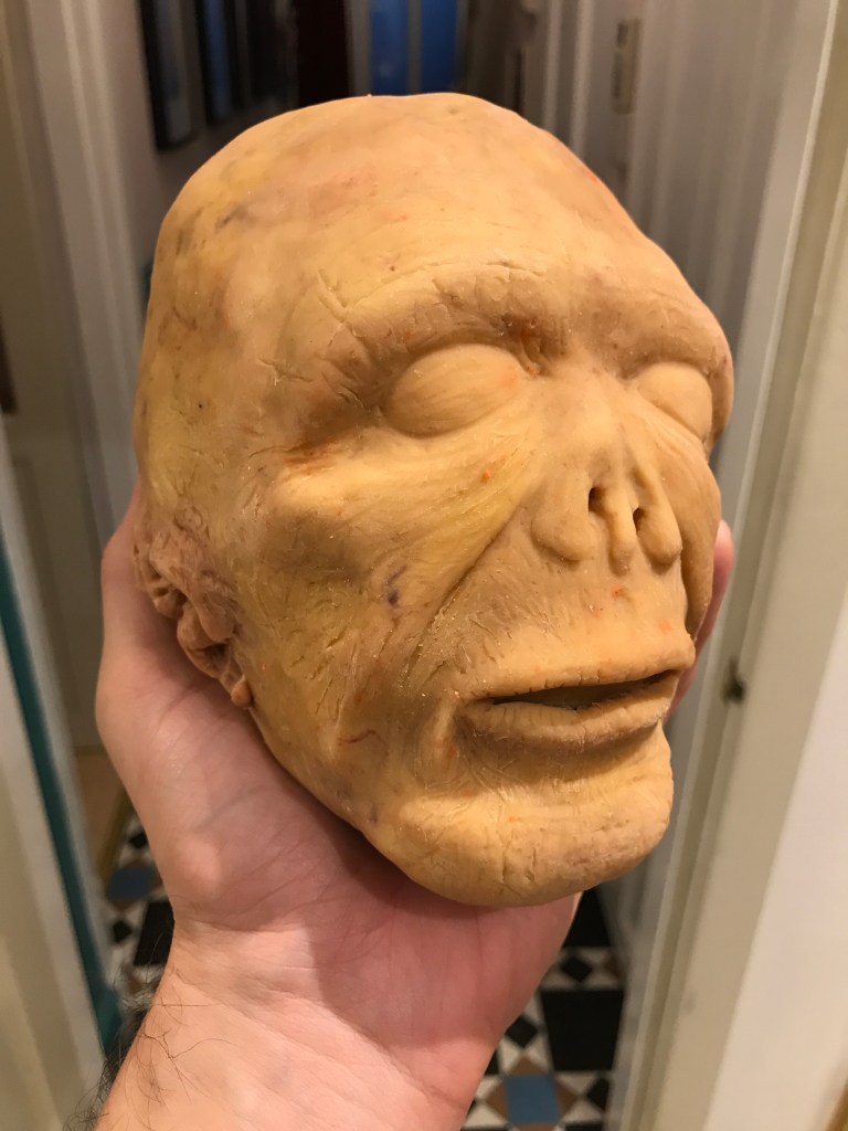 Here is the final oven-baked shrunken head number 2. Very different from the first. I can’t tell yet whether I like it or not. Is it too monotone? I think I need to paint inside the mouth, which I’m a bit nervous about.