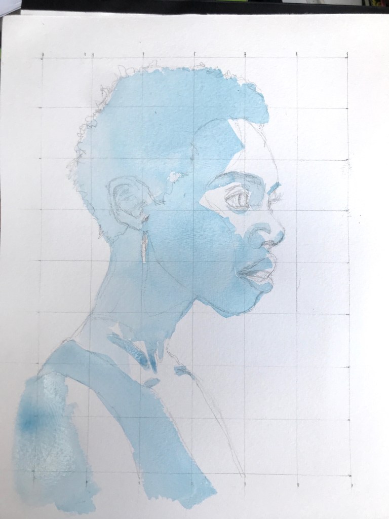 Following the tonal exercise I did for my Artistic Portrait with Watercolours, here is the start of my final project. You start with cool tones, then build up in layers of darker and warmer tones, until you somehow end up with some kind of portrait! It’s still a bit of an enigma to me.