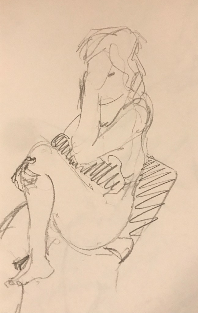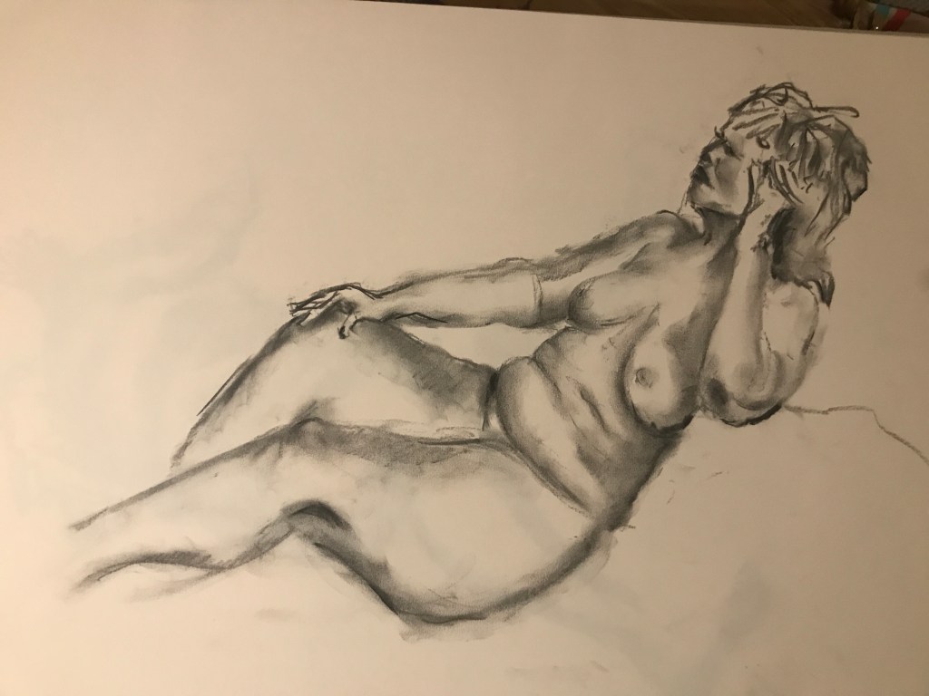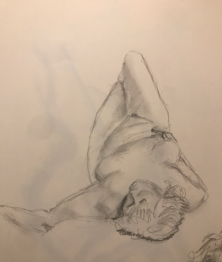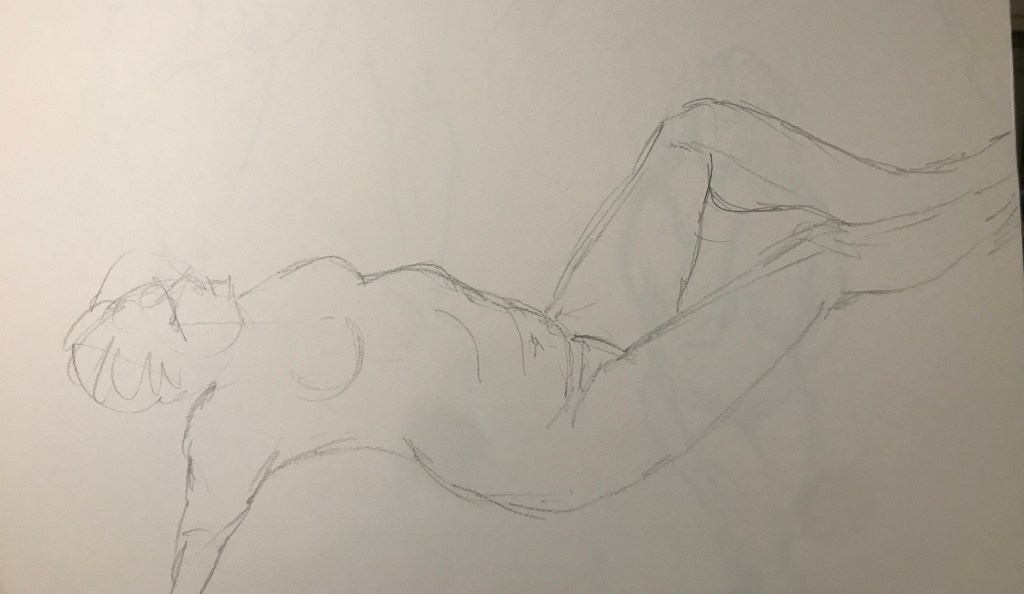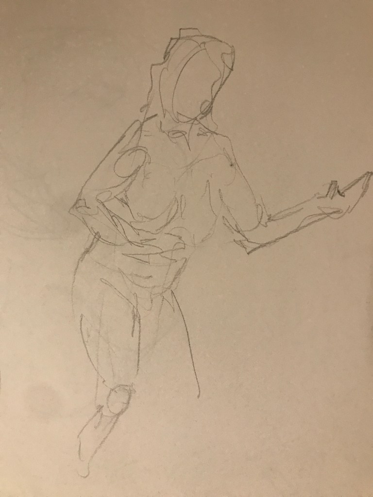 So anyway here are the results. I’ve started with the one I am happiest with, which was the final picture, a 15 minute pose. It’s funny because it was such a whirlwind that I didn’t actually really know what I had drawn until I got home and could look at them properly. Not amazing, but hey, it’s only the first session.