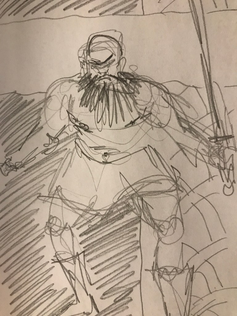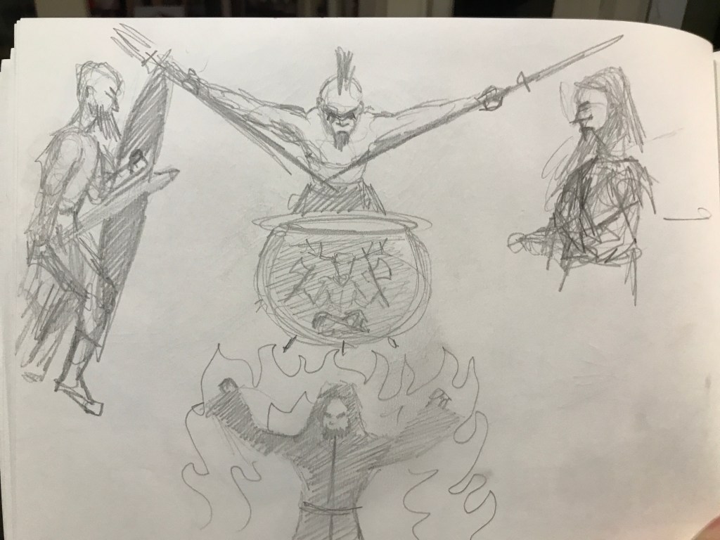 I was initially looking at illustrating the conflict with an image of the three champions around a cauldron lit by the fiery tongue of the troublemaker Bricriu but I have ended up playing with images of some of the characters almost in isolation, and just a couple of scenes from the story.