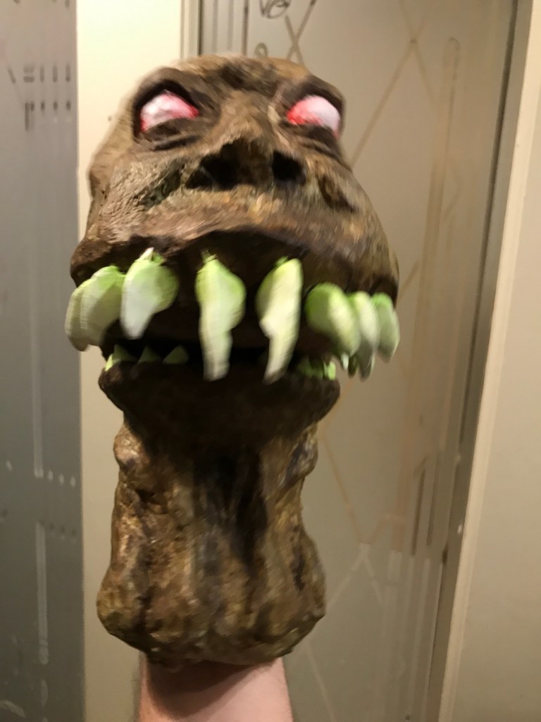 Here’s the latest on my Jenny Greenteeth puppet, all painted up a sort of swampy browny green.