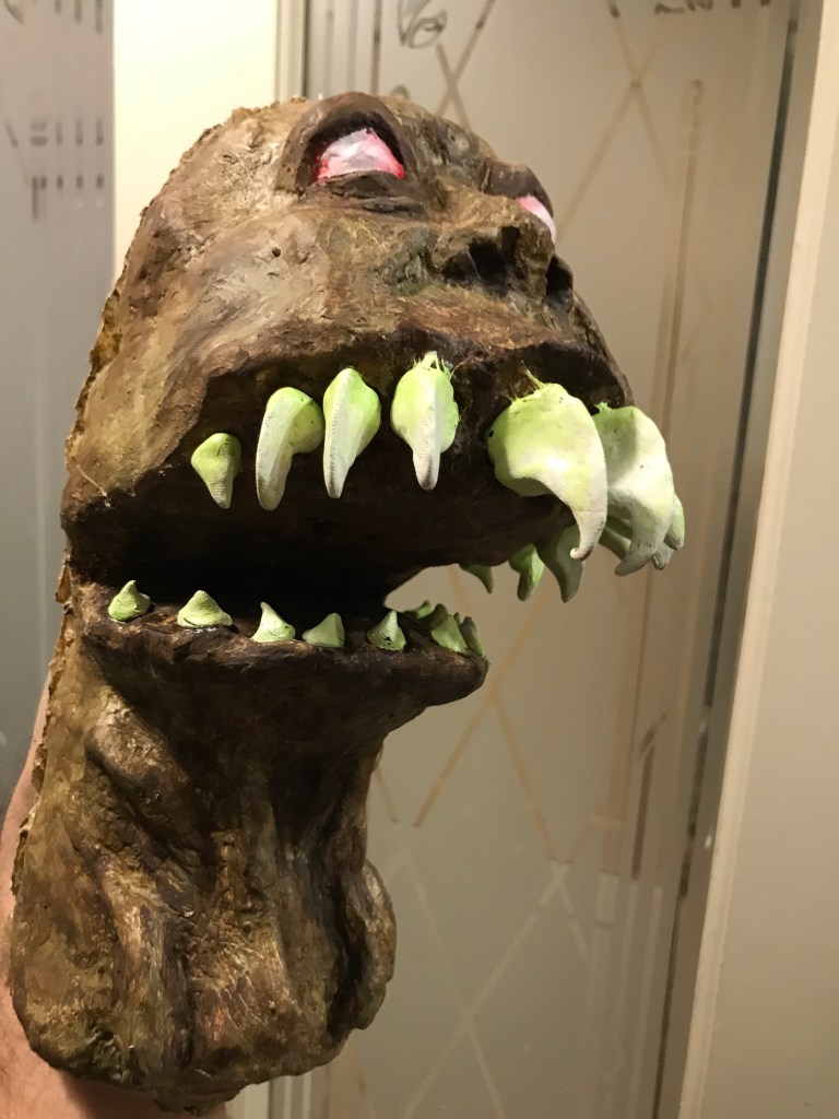 I struggled to make the teeth, and am very conscious that they are her main defining feature. I kind of like the goofy cartoony look. Also, sticking things to latex turns out to be really hard. I used contact cement, but they’re all pretty wobbly, I guess she’s not getting enough calcium.