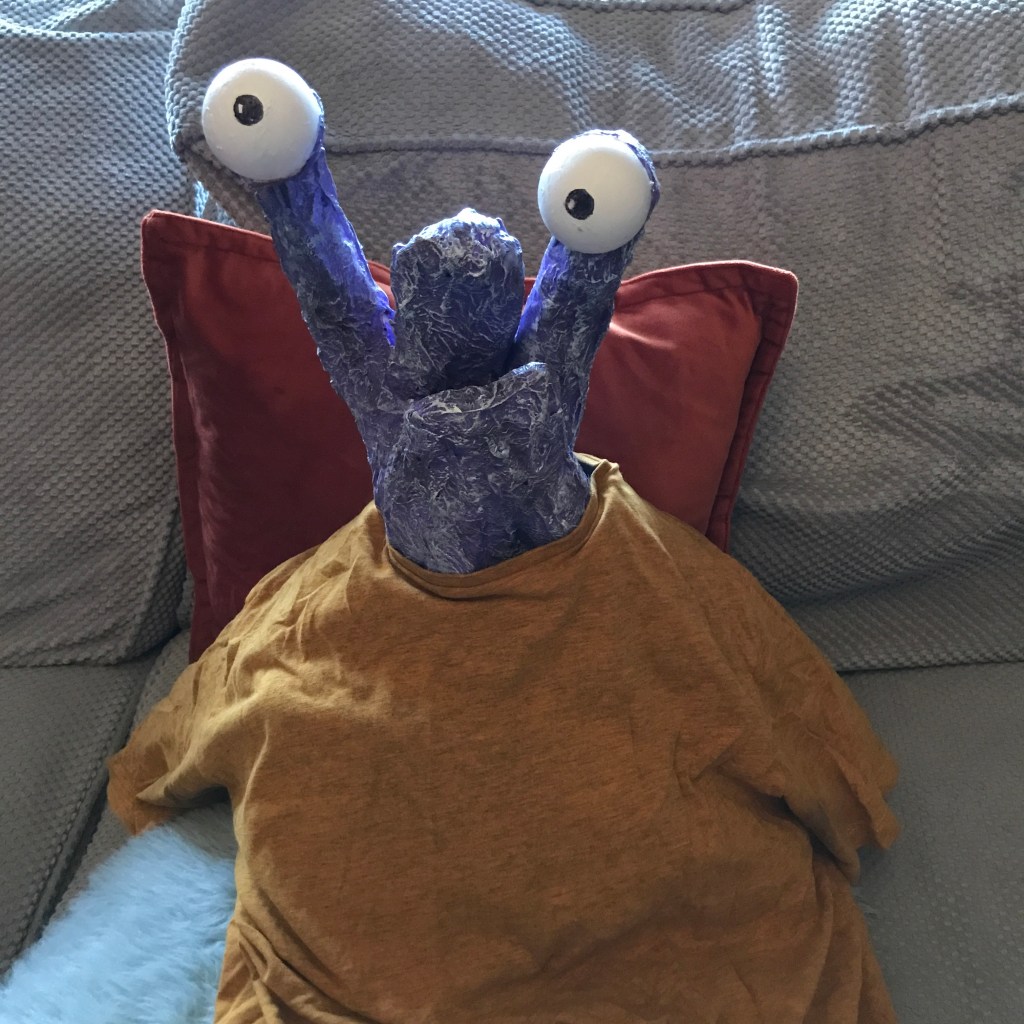 Here’s the latest on my Sluggish Puppet, his paint job is a bit more developed, and he has eyes.