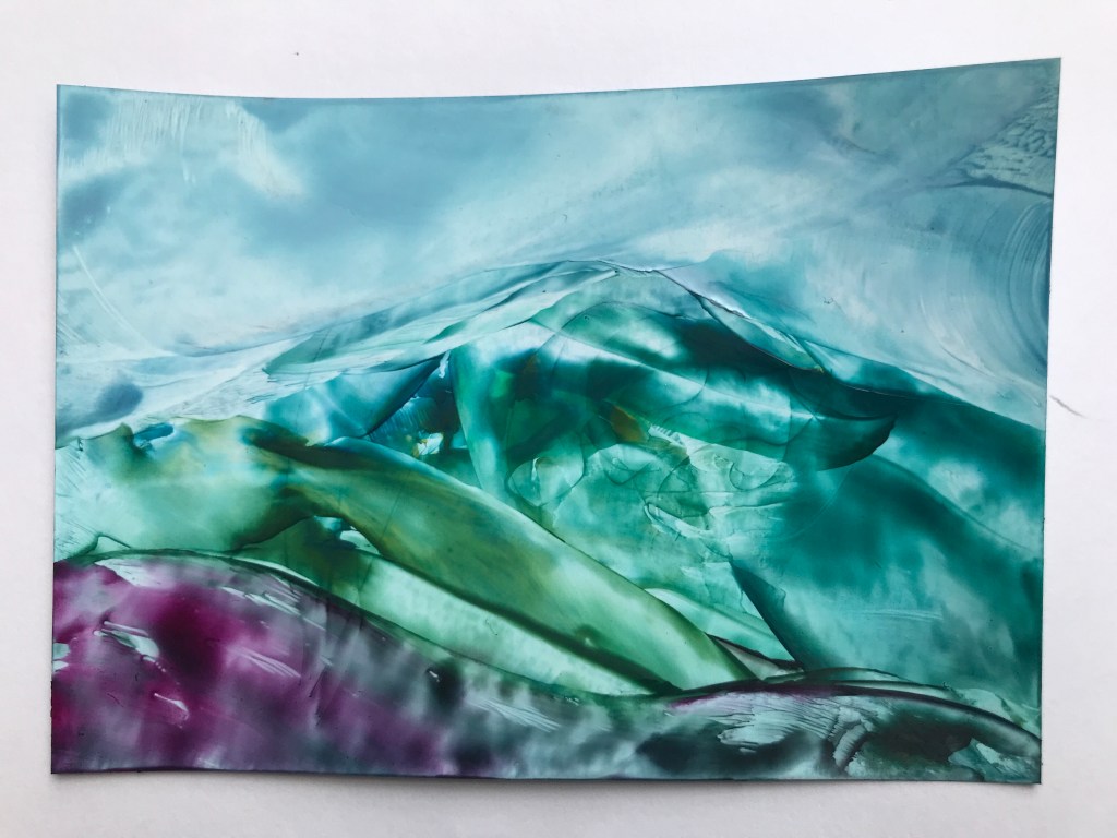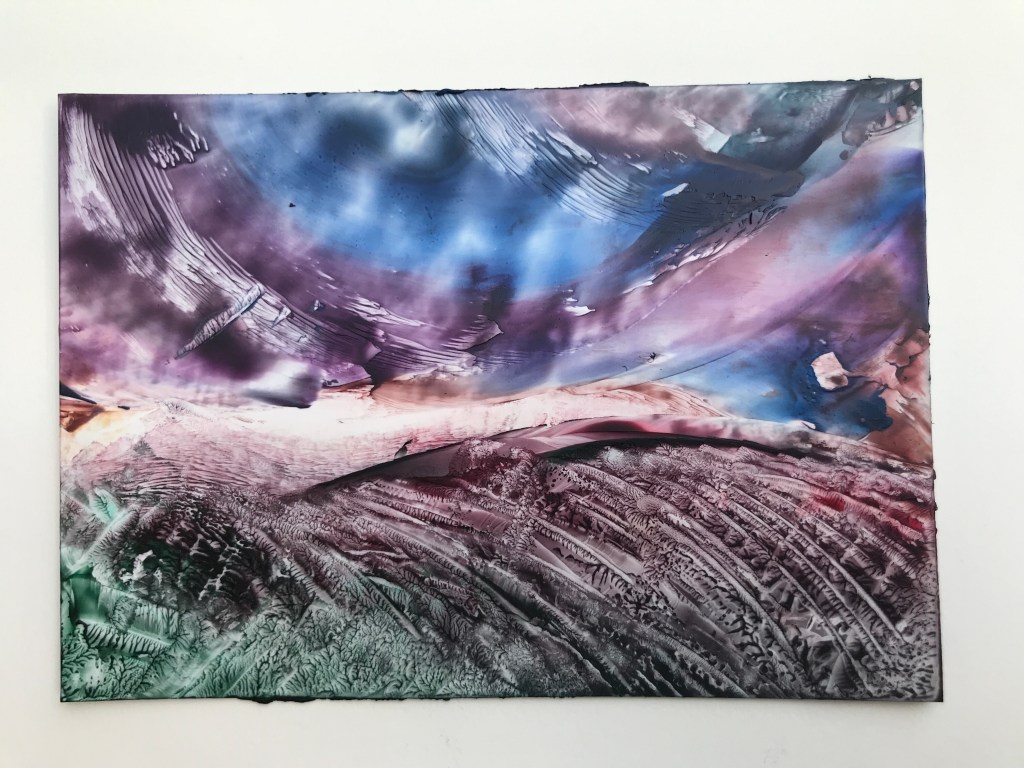 It was recently our 6th wedding anniversary, the theme of which is apparently ‘iron’ although I have no idea who decides these things. My wife Laura bought me an encaustic wax kit (which comes with a little iron), so I’ve been giving it a bit of a go. I’m definitely not a natural, but it’s quite fun and very different from anything I’ve done before. You rub the wax on the warm iron and then push it around on the piece of card to make nice shapes and textures.