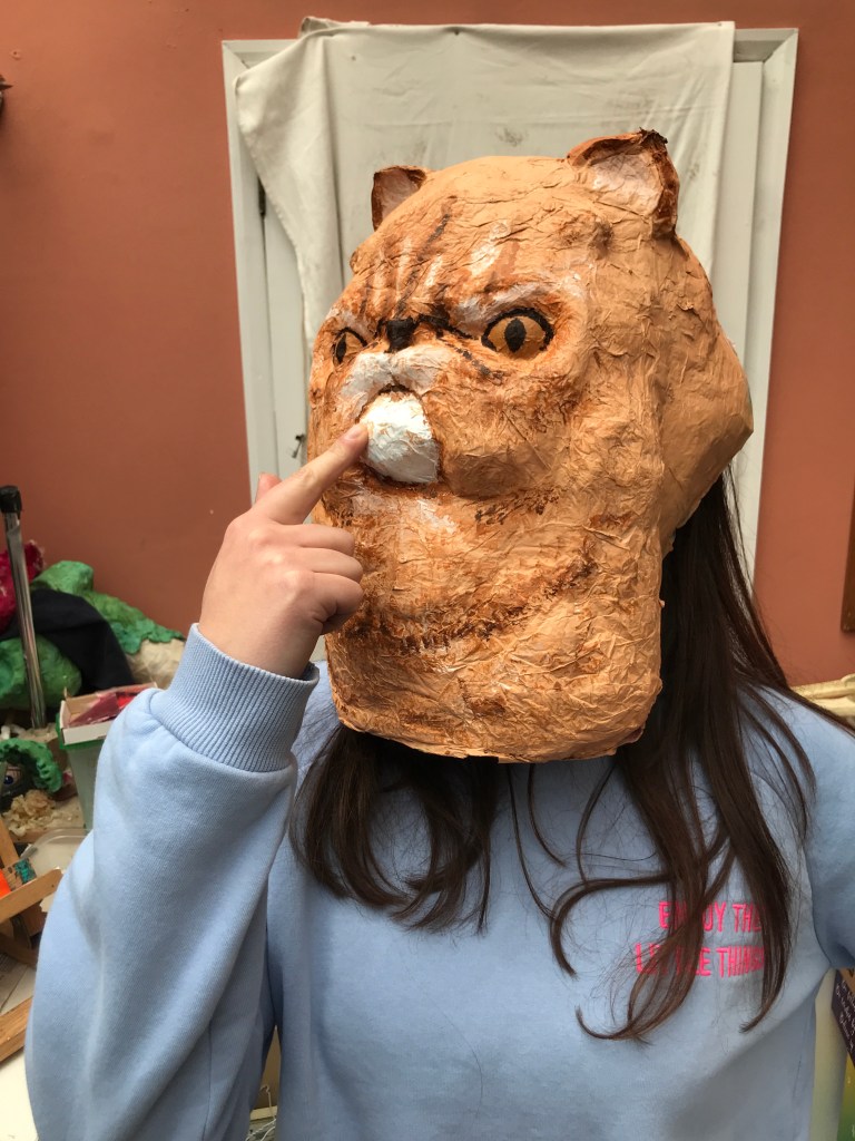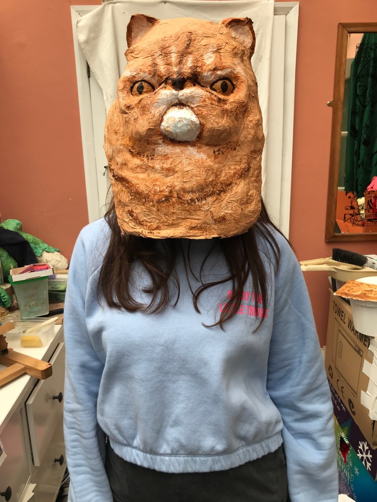 Here is the next stage of a pretty old project, Grumpy Cat. It’s a papier-mache mask, and the intention is to use it for another project, but we’ll see if that ever comes to pass.