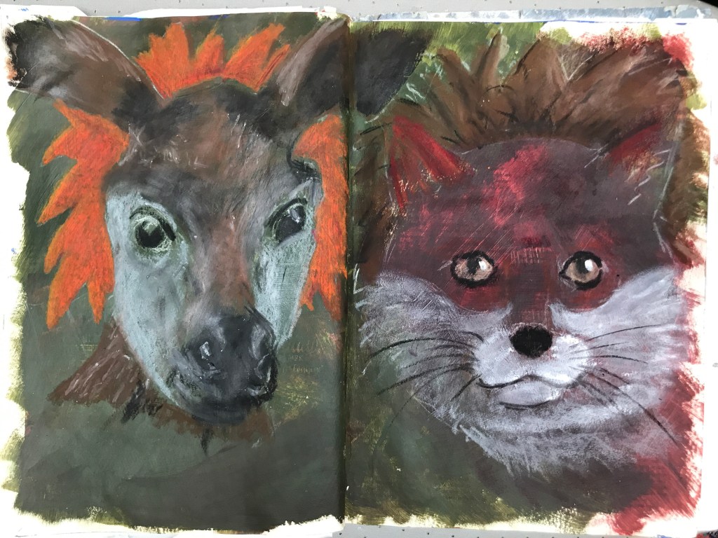 Some more images here from my illustrated story The Festival of Animals. Our hero spies a familiar fox, scurrying around with a graceful okapi. The isle is full of noises, sounds and sweet airs.