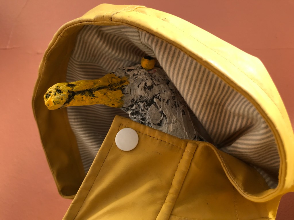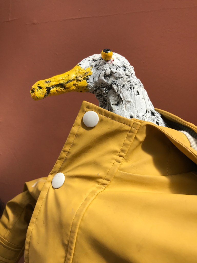 I have finally finished my gull character Gulliver. He has a head made of polyfilla, a body made of boxes of Christmas quality streets (empty!), legs made of stuffing and old tights, arms made of cardboard tubes and papier mache, and an old coat.