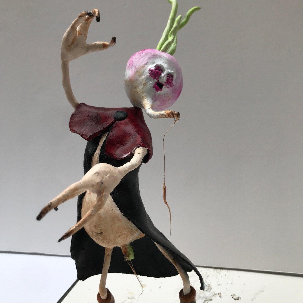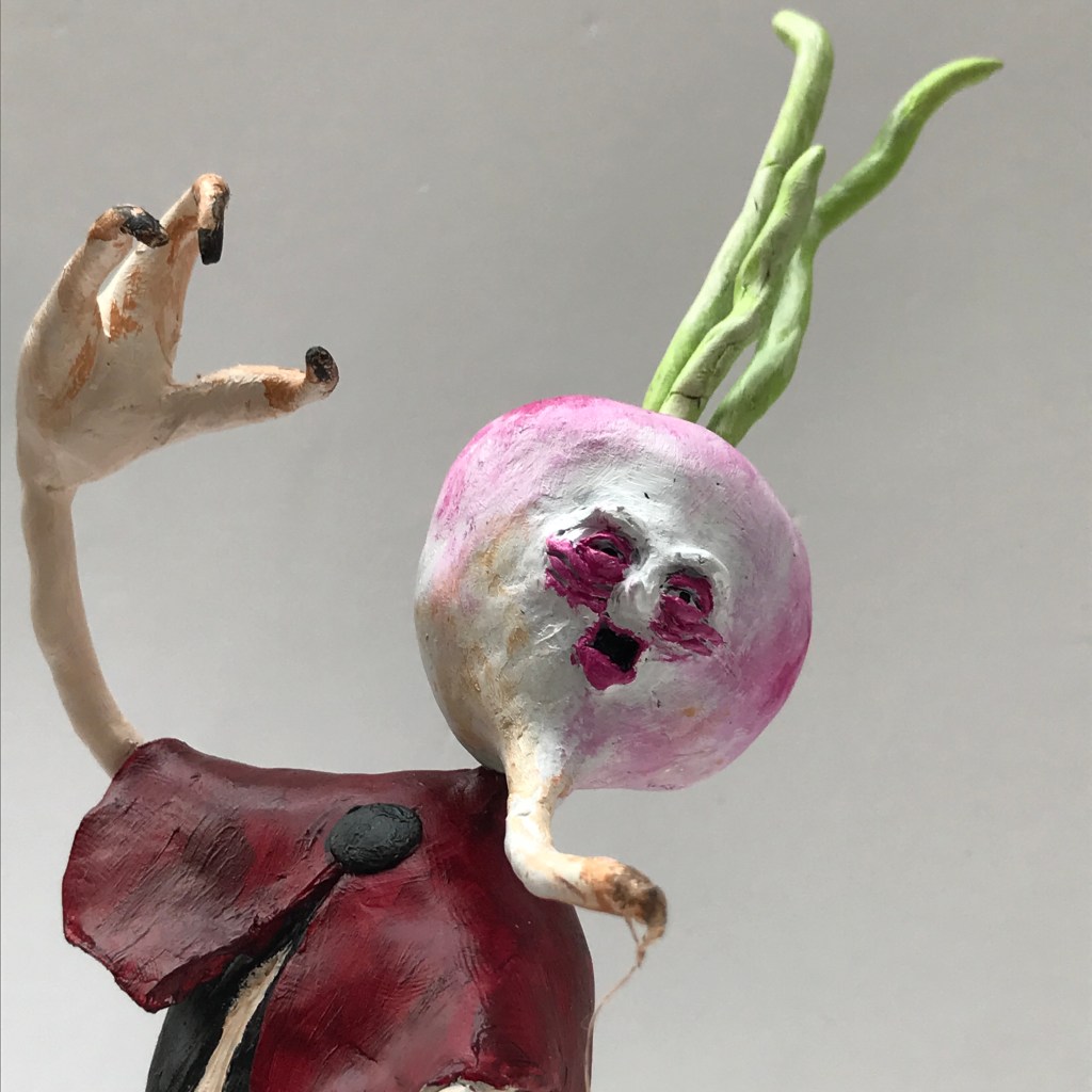 This is Bishop Turnip, the first in a planned series of scarecrow characters sculpted in polymer clay. I just wanted to try something a bit different and pour some energy into a bit more of a project. My Faces of Clay series has suggested that cartoony figures are probably a bit easier than trying to be realistic, and I’ve had the phrase The Parliament of Scarecrows rattling around in my head for a while.