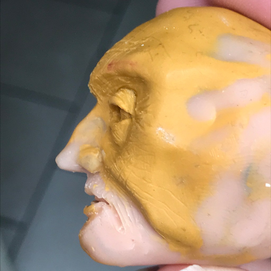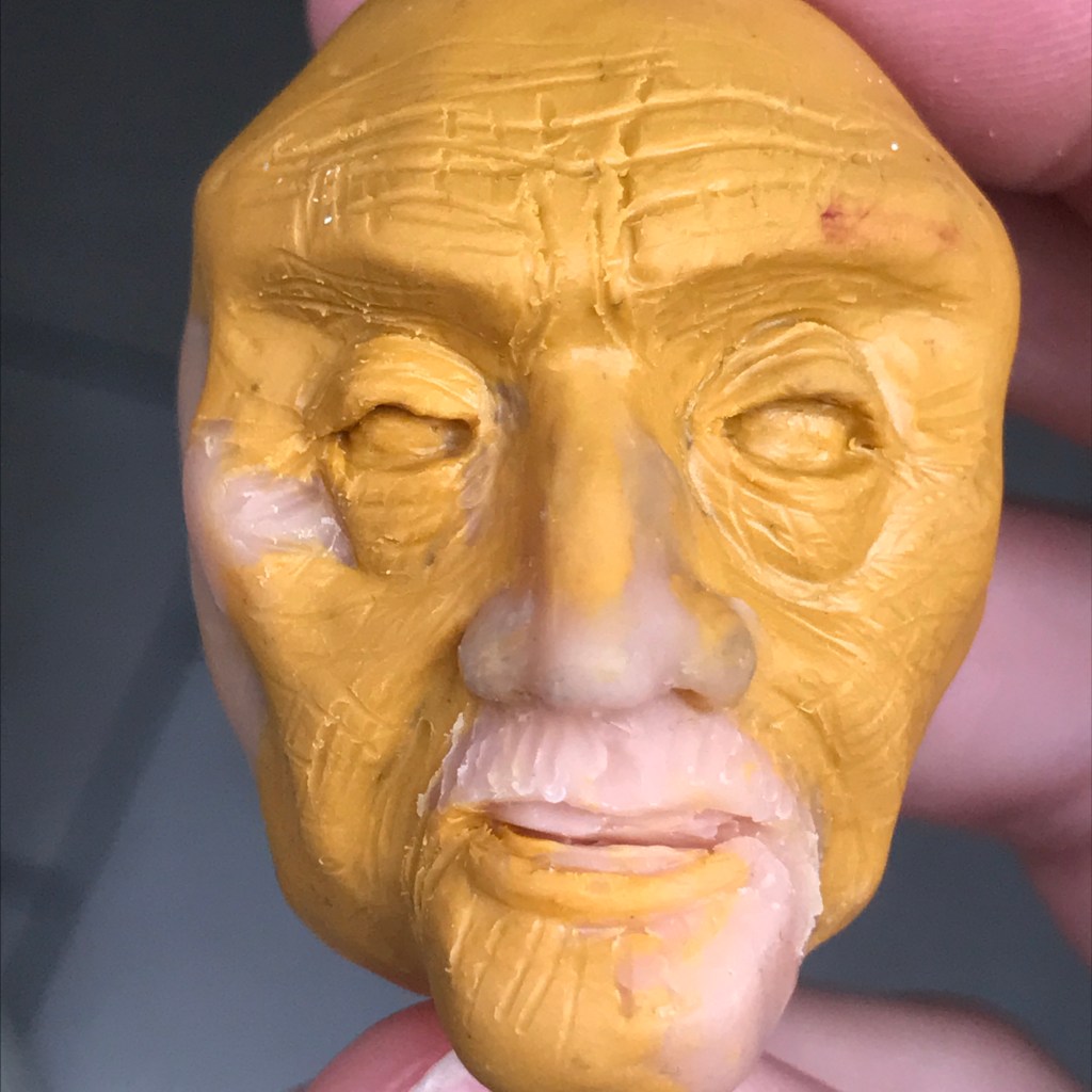 The next head in my 100 Heads project. I did think I might be better by now, but I’m not unhappy. I’m running out of polymer clay, so I’m combining bits of sculpey and bits of Fimo that I have kicking around, which is why he’s a mix of colours. Painted up, he might look a bit better.