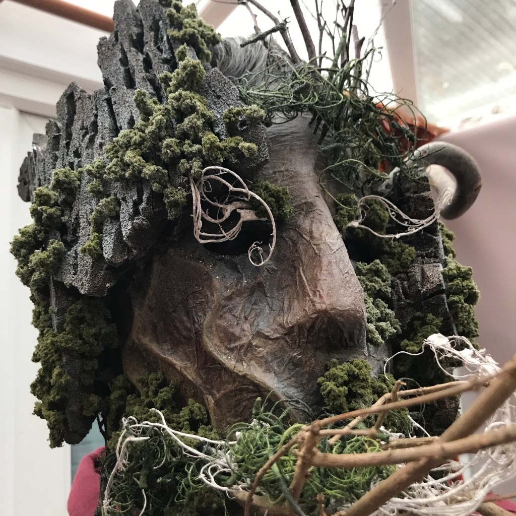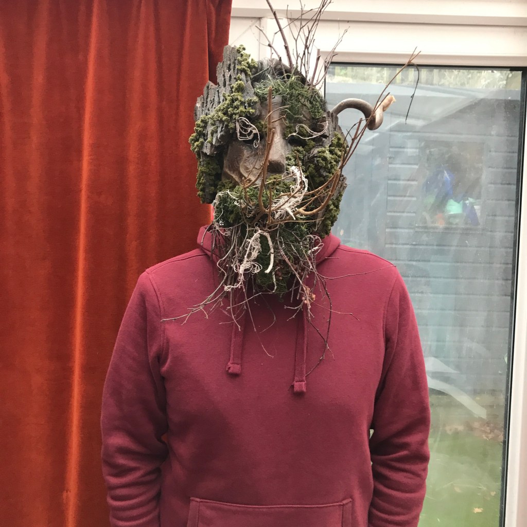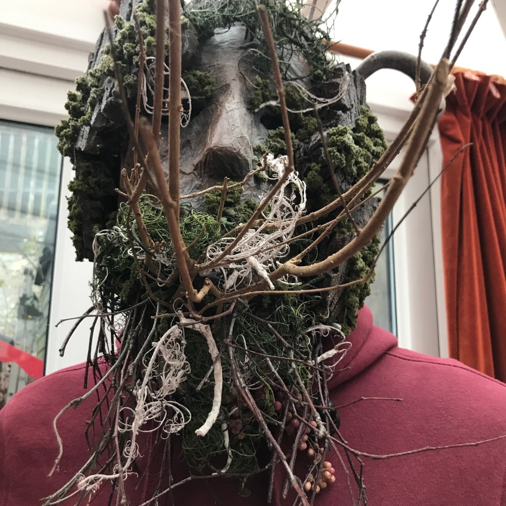 Here is my final mask representing a local spirit called Grandfather Ogden. Legend has it that he grew like a tree out of a patch of bloody earth where a young man was slain by robbers. Others say he emerged from a cocoon that grew in the corner of a half-rotten shed of an old widow, or that he was first seen as an entry in a local village scarecrow competition, or that he is merely an urban legend whispered about by Scouts on camp in the nearby fields.