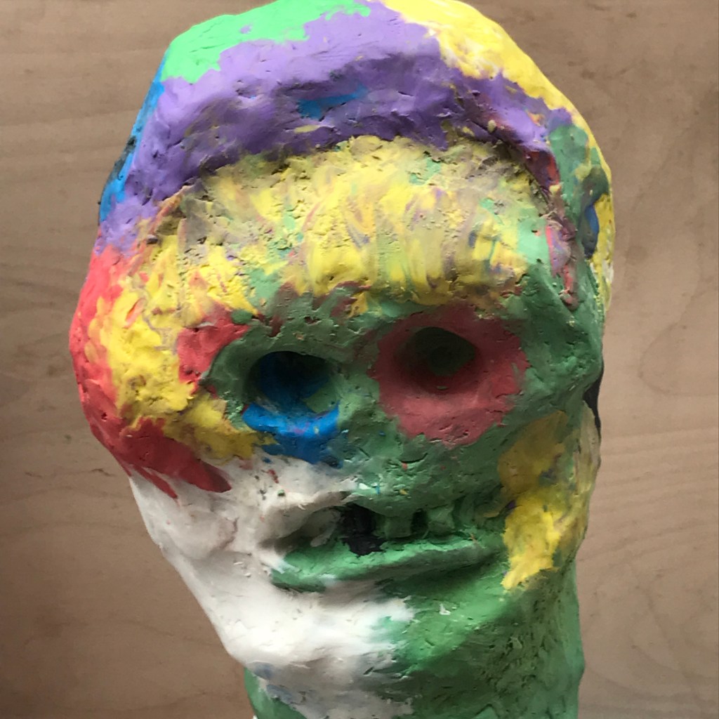 Here’s my sculpt in various colours of plasticine. This is the easy bit. Next I’ll have to mould it in plaster, then cast it in latex!
