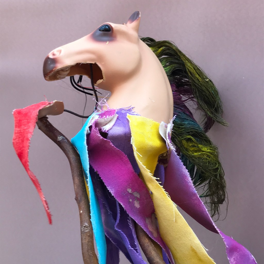 This was once a toy horse that has been repurposed as a sort of mini Mari-Lwyd entity. Its jaw is on a separate stick to allow it to speak, and the tattered strips are supposed to suggest the ragged Morris look. It has wires coming out of its eyes because I’m interested in the dramatic possibilities of folk culture encountering technology.