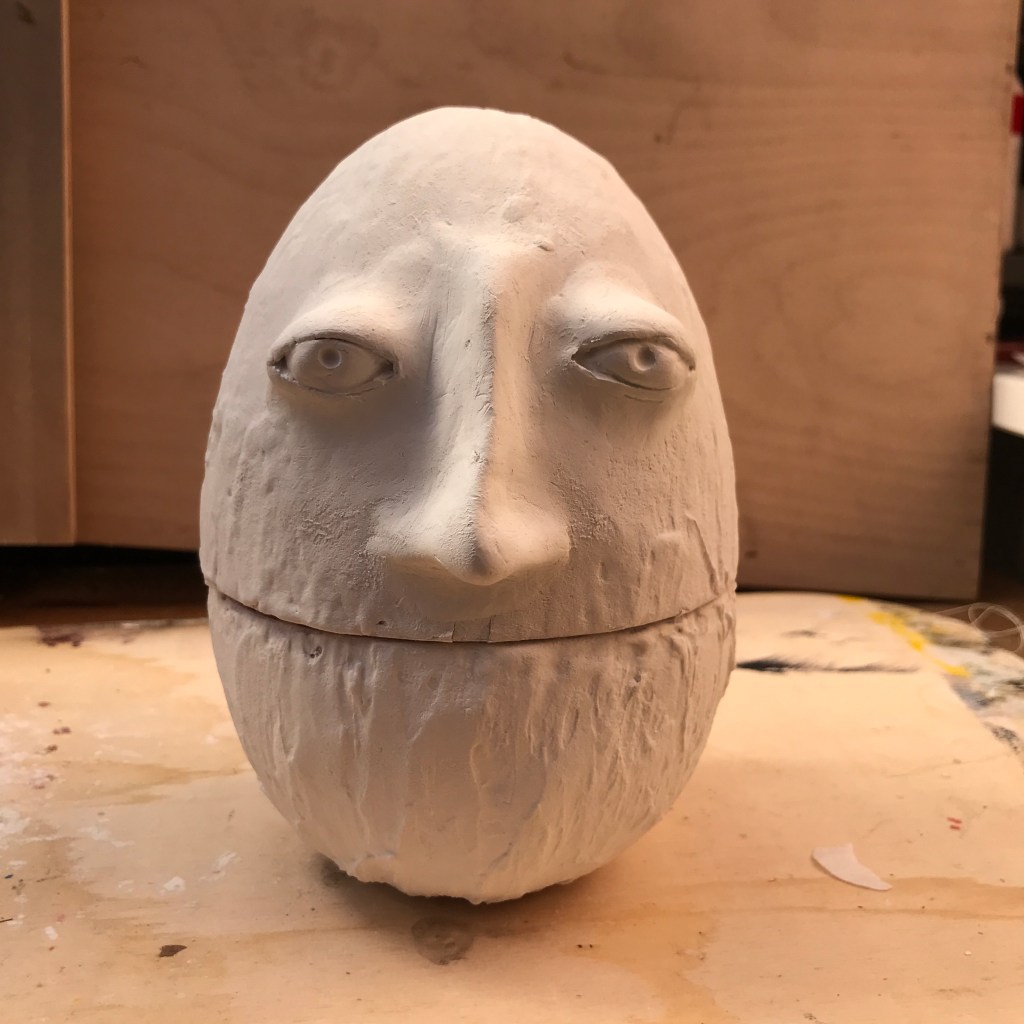Just for fun, here’s a puppet made out of a plastic egg and covered in polyfilla. I wanted his mouth to be a fried egg with the yolk as a tongue. The yolk is made of felt but I didn’t have any white felt, so I thought I’d try and make a sort of white papier mache paste, but it didn’t really work so I’ll try and fix that.