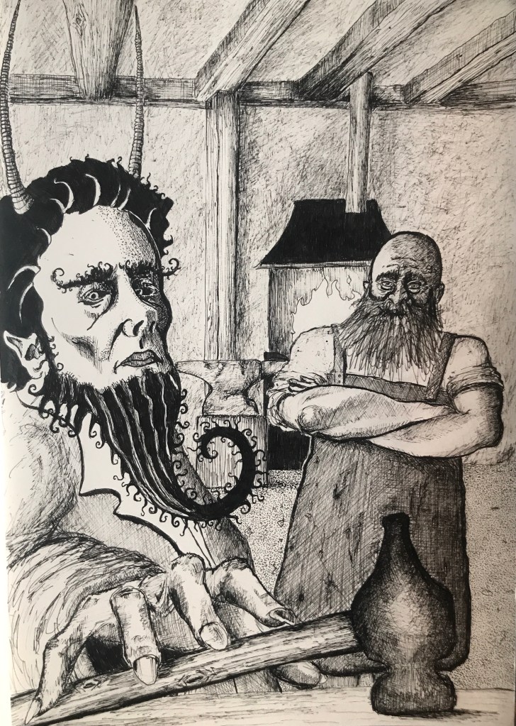 In this story, the unpleasant blacksmith Jack has been granted three wishes by St Patrick, and uses these wishes to trick the Devil when he comes to claim his damned soul. The first is to enchant a hammer to attack whoever holds it by beating them around the head, until commanded otherwise by Jack. The Devil is foolish enough to fall for the trick, and grants Jack another seven years before coming back for his soul.