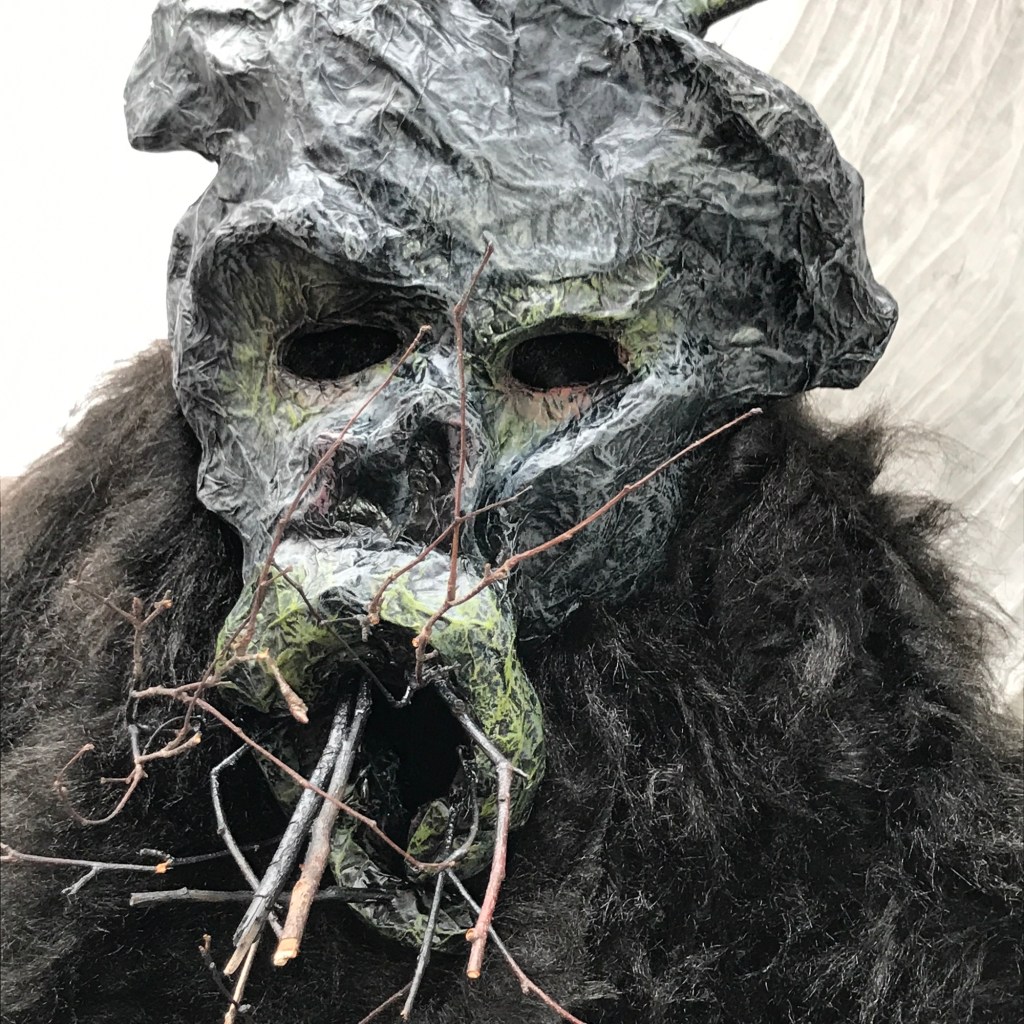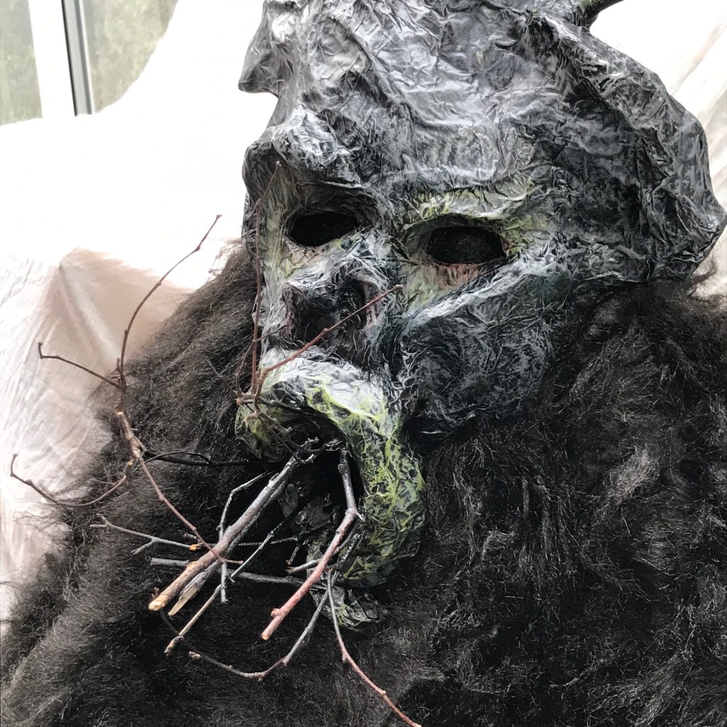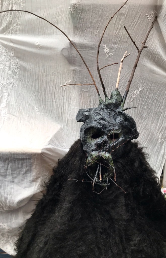Here is the final mask I have made in a folk themed series, which were used at a Halloween Event last year. This is the demonic god of darkness, who wishes to usher in the eternal winter. I was a bit rushed by this point, my initial idea was to have far more sticks coming out as sort of horns, and I would’ve liked to have added more texture into the ‘skin’, but it served its purpose. It’s quite hard to photograph I’m afraid.