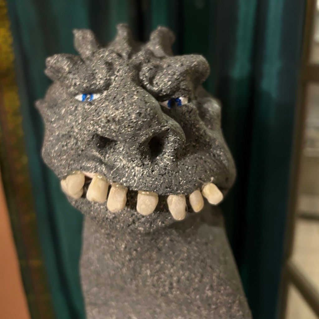 Anyway, he’s the latest in a series of simple latex puppets, and has little stones for teeth.